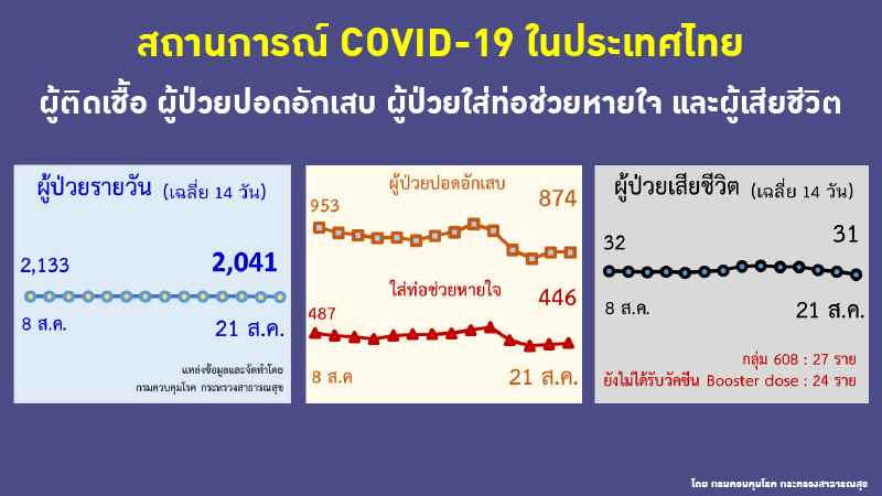 อนึ่ง เมื่อเวลา 08.00 น.สำนักข่าวอิศรา (www.isranews.org) รายงานสถานการณ์แพร่ระบาดของโรคโควิด-19 ประเทศไทยประจำวันที่ 21 ส.ค.2565 ว่า มีจำนวนผู้ติดเชื้อใหม่ที่ต้องเข้ารับการรักษาในโรงพยาบาลเพิ่ม 1,968 ราย เป็นผู้ป่วยในประเทศทั้งหมด