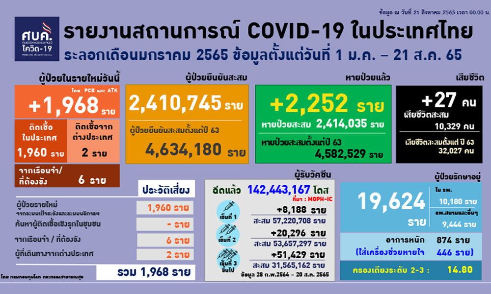 สำนักข่าวอิศรา (www.isranews.org) รายงานว่า เมื่อวันที่ 21 ส.ค. 2565 ศูนย์บริหารสถานการณ์โควิด-19 (ศบค.) รายงานสถานการณ์ประจำวัน โดยพบผู้ป่วยรายใหม่ 1,968 ราย จำแนกเป็น ติดเชื้อในประเทศ 1,960 ราย เกิดจากระบบเฝ้าระวังและระบบบริการฯ 1,960 ราย ไม่มีรายงานผู้ติดเชื้อภายในเรือนจำ 6 ราย มีผู้ป่วย 2 รายเดินทางจากต่างประเทศ รวมผู้ป่วยสะสม 4,634,180 ราย