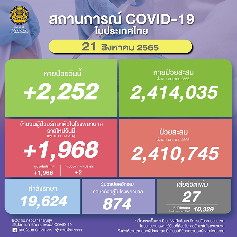 ส่วนการรักษา มีผู้หายป่วยกลับบ้านเพิ่ม 2,252 ราย ยอดหายป่วยสะสม (ตั้งแต่ 1 มกราคม 2565) 2,414,035 ราย อยู่ระหว่างรักษาตัว 19,624 ราย