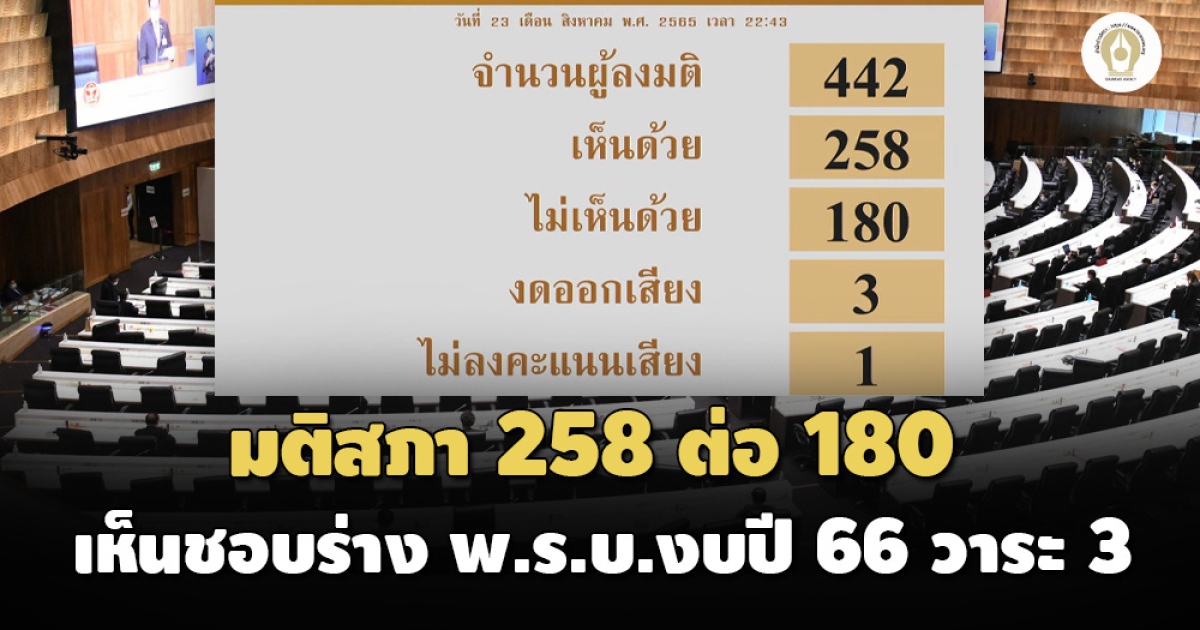 มติสภา 258 ต่อ 180 เสียง เห็นชอบร่าง พ.ร.บ.งบปี 66 วาระ 3 ขณะที่รองโฆษกรัฐบาลเผย นายกฯขอบคุณและพร้อมรับข้อเสนอแนะไปปรับใช้ให้เกิดการใช้จ่ายอย่างมีประสิทธิภาพมากยิ่งขึ้น
