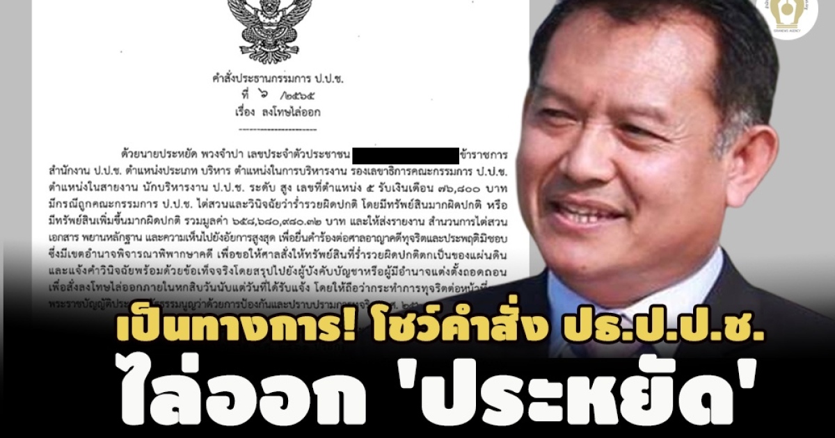 โชว์คำสั่ง พล.ต.อ.วัชรพล ประสารราชกิจ ปธ.ป.ป.ช. ลงนามไล่ออกจากราชการ 'ประหยัด พวงจำปา' รองเลขาธิการฯ หลังถูกชี้มูลความผิดคดีร่ำรวยผิดปกติ 658 ล้าน เปิดโอกาสยื่นคำฟ้องศาลปค.โต้แย้งได้ภายใน 90 วัน - อัตราเงินเดือนสุดท้าย 76,800 บาท