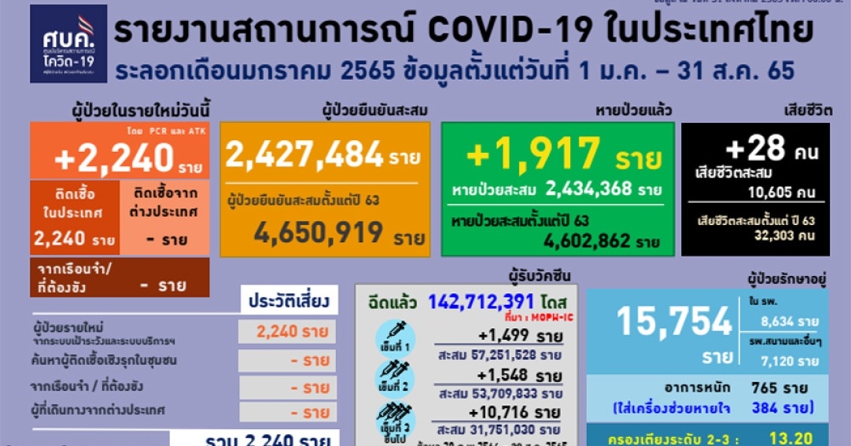 สำนักข่าวอิศรา (www.isranews.org) รายงานว่า เมื่อวันที่ 31 ส.ค. 2565 ศูนย์บริหารสถานการณ์โควิด-19 (ศบค.) รายงานสถานการณ์ประจำวัน โดยพบผู้ป่วยรายใหม่ 2,240 ราย จำแนกเป็น ติดเชื้อในประเทศ 2,240 ราย จากระบบเฝ้าระวังและระบบบริการฯ ไม่มีรายงานผู้ติดเชื้อในเรือนจำและจากต่างประเทศ รวมผู้ป่วยสะสม 4,650,919 ราย