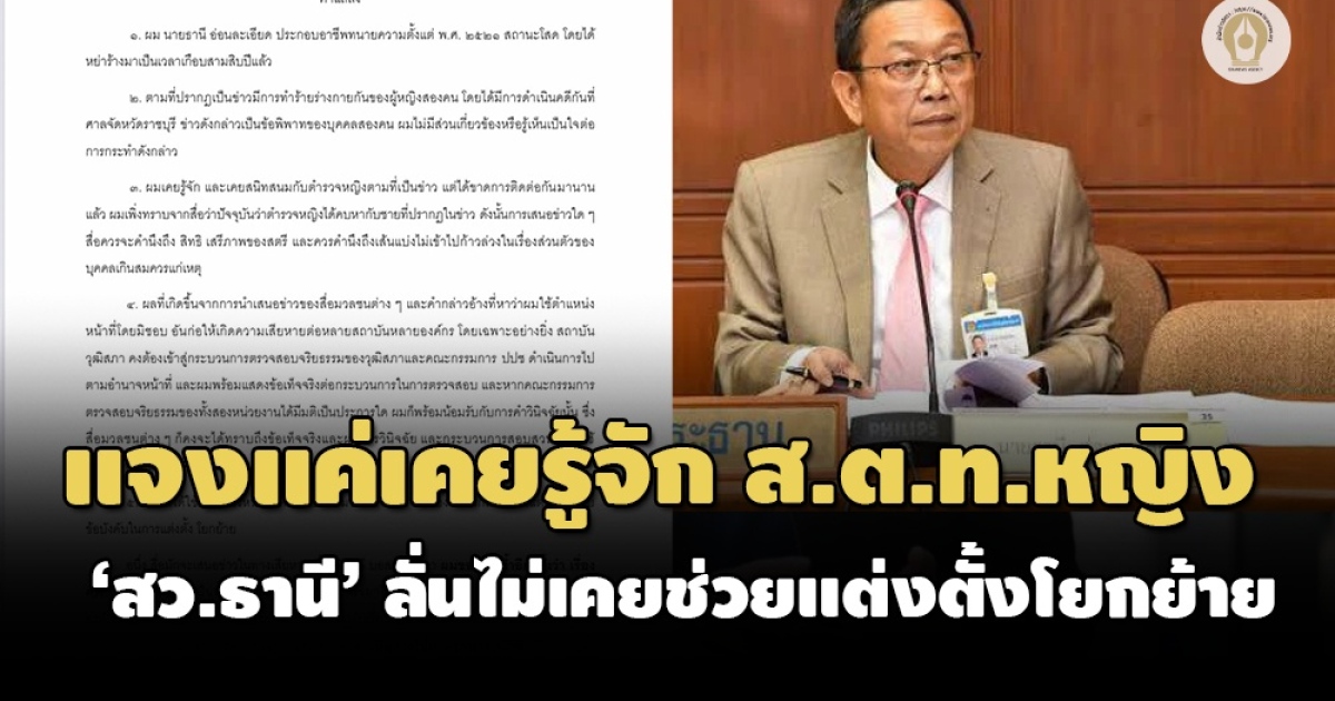 'ธานี อ่อนละเอียด' ทำหนังสือแจงสื่อรับเคยสนิทกับสิบตำรวจโทหญิง แต่ไม่ได้ติดต่อนานแล้ว ยันไม่เคยใช้ตำแหน่งหน้าที่โดยมิชอบแต่งตั้งโยกย้าย โอดสื่อทำข่าวต้องคำนึงถึง สิทธิ เสรีภาพสตรี ลั่นให้ทีมงานจับตาทุกเพจสื่อแล้ว ย้อนเกล็ดสื่อเสนอข่าวเสียหายคดีบอส แจงแค่ทำตามกระบวนการ