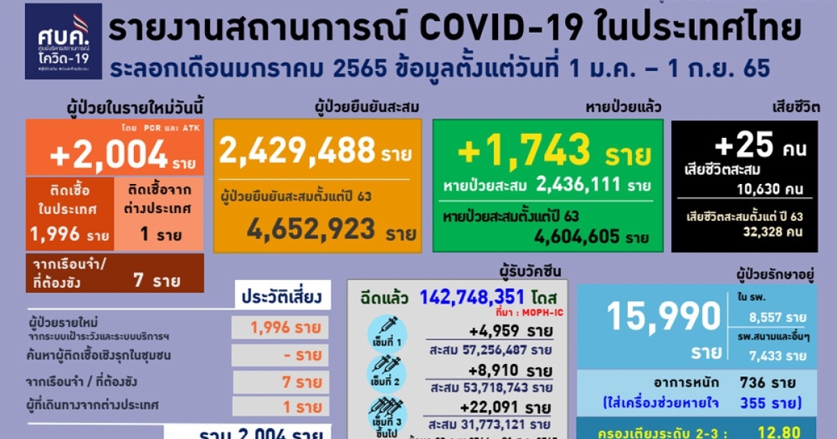 สำนักข่าวอิศรา (www.isranews.org) รายงานว่า เมื่อวันที่ 1 ก.ย. 2565 ศูนย์บริหารสถานการณ์โควิด-19 (ศบค.) รายงานสถานการณ์ประจำวัน โดยพบผู้ป่วยรายใหม่ 2,004 ราย จำแนกเป็น ติดเชื้อในประเทศ 2,003 ราย เป็นจากระบบเฝ้าระวังและระบบบริการฯ 1,996 ราย และติดเชื้อในเรือนจำ 7 ราย และจากต่างประเทศ 1 ราย รวมผู้ป่วยสะสม 4,652,923 ราย