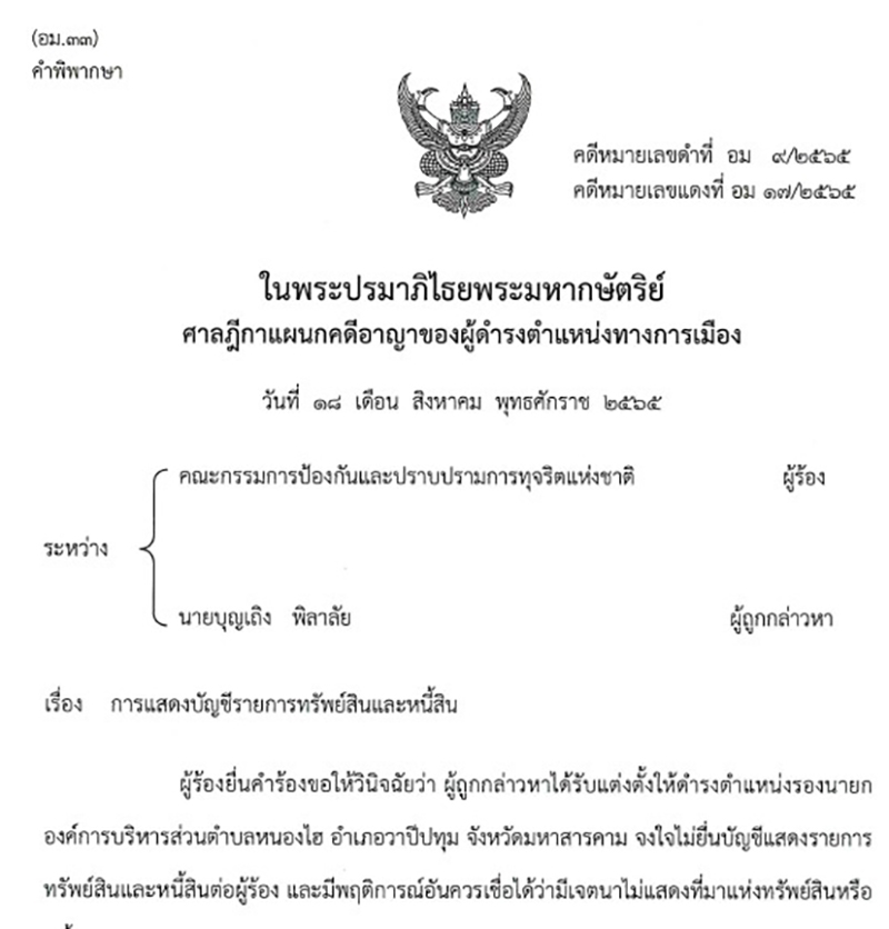 - ที่ประชุมใหญ่ศาลฎีกายืนขาดอายุความ รองนายก อบต.คูเมือง อุบลฯไม่ยื่นบัญชีฯ