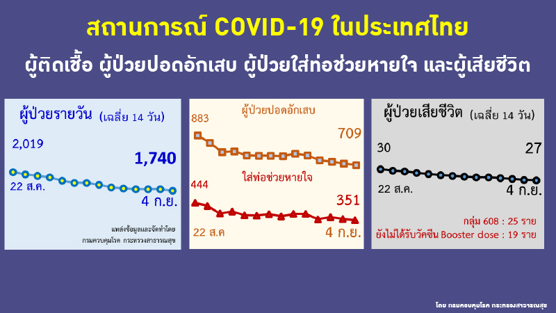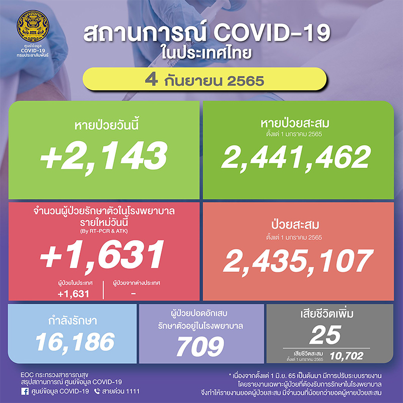 อนึ่งเมื่อเวลา 08.00 น.สำนักข่าวอิศรา รายงานสถานการณ์แพร่ระบาดของโรคโควิด-19 ประเทศไทยประจำวันที่ 4 ก.ย.2565 ว่า มีจำนวนผู้ติดเชื้อใหม่ที่ต้องเข้ารับการรักษาในโรงพยาบาลเพิ่ม 1,631 ราย เป็นผู้ป่วยในประเทศทั้งหมด