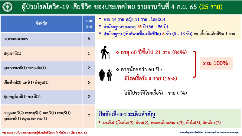 เสียชีวิตเพิ่ม 25 ราย มาจาก กทม. 8 ราย ปริมณฑล 1 ราย ภาคตะวันออกเฉียงเหนือ 2 ราย ภาคเหนือ 5 ราย ภาคใต้ 2 ราย ภาคกลางและภาคตะวันตก 2 ราย ทั้งนี้ ผู้เสียชีวิตเป็นกลุ่ม 608 คิดเป็น 100% และยังไม่ได้รับวัคซีนเข็มกระตุ้น 19 ราย รวมเสียชีวิตสะสม 32,400 ราย
