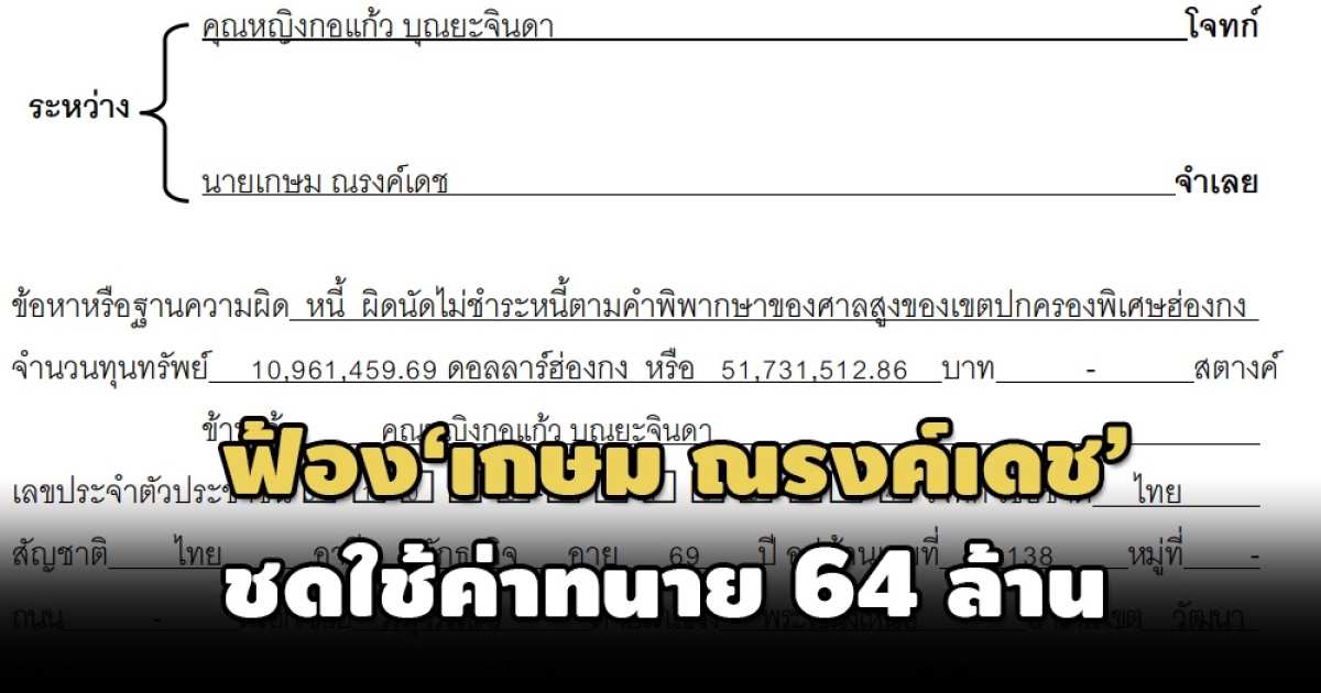 ดังนั้น เมื่อหนี้ตามคำพิพากษาหรือคำสั่งศาลฮ่องกงดังกล่าว เป็นหนี้ที่เกิดขึ้นโดยชอบด้วยกฎหมายของเขตการปกครองพิเศษ และมีผลผูกพันในการบังคับนายเกษมโดยชอบด้วยกฎหมาย แต่นายเกษม กลับจงใจเพิกเฉยไม่ยอมชำระหนี้ดังกล่าวแก่โจทก์ (คุณหญิงกอแก้ว) ทำให้โจทก์ได้รับความเสียหาย โจทก์จึงมาฟ้องคดีในวันที่ 2 ก.ย.2565 ให้นายเกษม ต้องรับผิดชอบหนี้และค่าเสียหายให้แก่โจทก์ เป็นเงิน 10.59 ล้านดอลลาร์ฮ่องกง หรือ 51.73 ล้านบาท