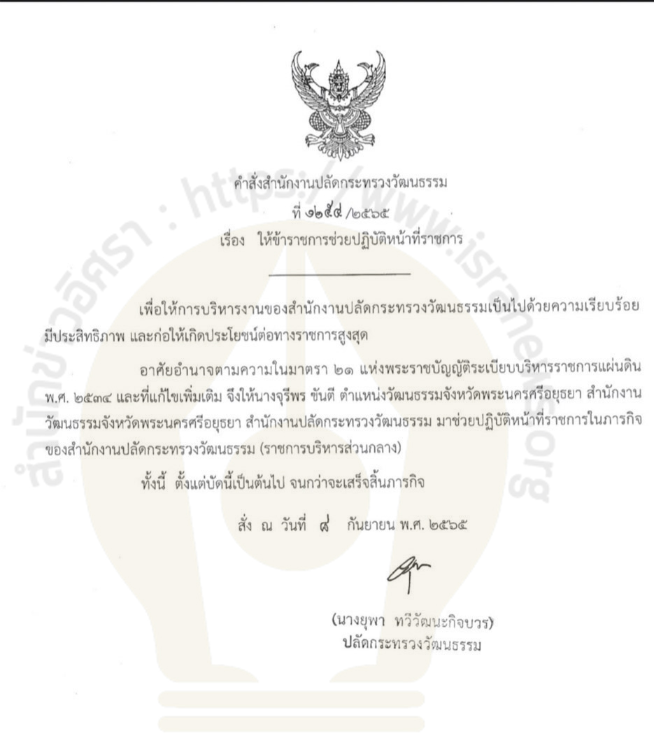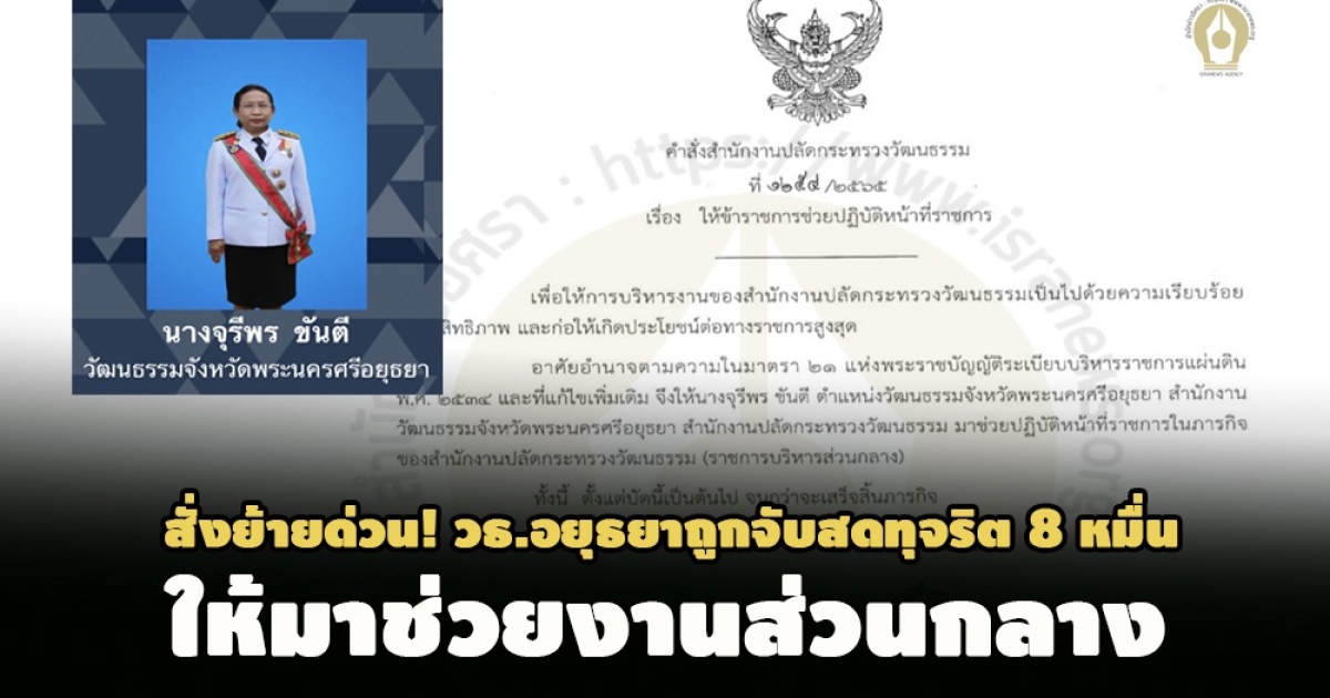 ปลัดกระทรวงวัฒนธรรม ลงนามคำสั่งย้ายด่วน 'จุรีพร ขันตี' วธ.อยุธยา เข้ามาช่วยราชการส่วนกลางแล้ว หลังถูกจับสดทุจริตเงิน 8 หมื่น จ้างทิพย์จัดพิธีกรรมบวงสรวงเทพยดา ระบุให้มีผลตั้งแต่วันที่ 8 ก.ย.65 จนกว่าจะเสร็จสิ้นภารกิจ แจ้งผู้ว่าฯ รับทราบด้วย