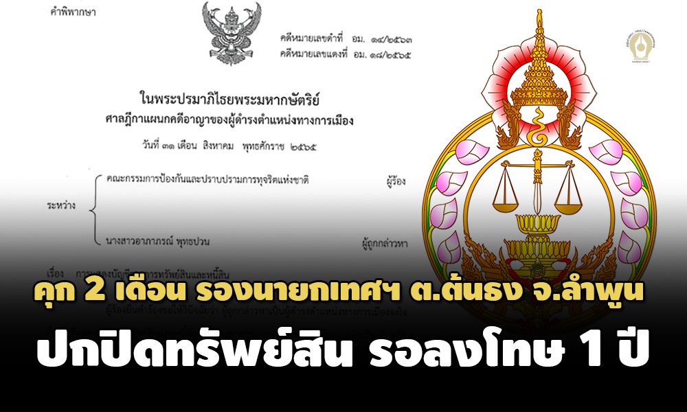 ศาลฎีกาฯพิพากษา ‘อาภาภรณ์ พุทธปวน’ รองนายกเทศมนตรีตำบลต้นธง จ.ลำพูน จงใจยื่นบัญชีทรัพย์สินเท็จ ป.ป.ช. ปกปิด 5 รายการ ห้ามดำรงตำแหน่งการเมือง 5 ปี จำคุก 2 เดือน ปรับ 8,000 บาท รอลงโทษ 1 ปี