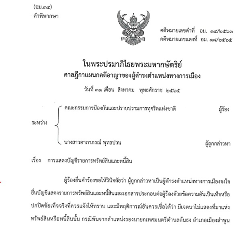 สำนักข่าวอิศรา (www.isranews.org) รายงานว่า เมื่อวันที่ 31 สิงหาคม 2565 ศาลฎีกาแผนกคดีอาญาของผู้ดำรงตำแหน่งทางการเมือง มีคำพิพากษาว่านางสาวอาภาภรณ์ พุทธปวน รองนายกเทศมนตรีตําบลต้นธง อําเภอเมืองลําพูน จังหวัดลําพูน ผู้ถูกกล่าวหา จงใจยื่นบัญชีแสดงรายการทรัพย์สินและหนี้สินและเอกสารประกอบต่อคณะกรรมการป้องกันและปราบปรามการทุจริตแห่งชาติ (คณะกรรมการ ป.ป.ช.) ผู้ร้อง ด้วยข้อความอันเป็นเท็จหรือปกปิดข้อเท็จจริงที่ควรแจ้งให้ทราบ และมีพฤติการณ์อันควรเชื่อได้ว่า มีเจตนาไม่แสดงที่มาแห่งทรัพย์สินหรือหนี้สินนั้น โดยไม่แสดงทรัพย์สิน 5 รายการ กรณีพ้นจากตําแหน่งรองนายกเทศมนตรีตําบลต้นธง ห้ามมิให้ผู้ถูกกล่าวหาดํารงตําแหน่งทางการเมืองหรือดํารงตําแหน่งใดในพรรคการเมืองเป็นเวลาห้าปี นับแต่วันที่ 5 กุมภาพันธ์ 2559 ซึ่งเป็นวันที่ผู้ถูกกล่าวหาพ้นจากตําแหน่ง ตามพระราชบัญญัติประกอบรัฐธรรมนูญว่าด้วยการป้องกันและปราบปรามการทุจริต พ.ศ. 2542 มาตรา 34 วรรคสอง กับมีความผิด ตามพระราชบัญญัติประกอบรัฐธรรมนูญว่าด้วยการป้องกันและ ปราบปรามการทุจริต พ.ศ. 2542 มาตรา 119 จําคุก 2 เดือน และปรับ 8,000 บาท ไม่ปรากฏว่าผู้ถูกกล่าวหาเคยได้รับโทษจําคุกมาก่อน จึงให้รอการลงโทษจําคุกไว้ 1 ปี (คดีหมายเลขแดงที่ อม.18/2565 วันที่ 31 สิงหาคม 2565)
