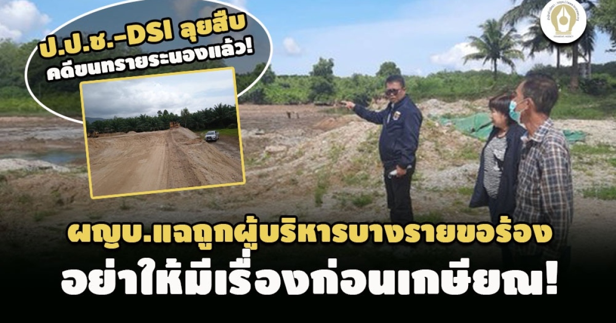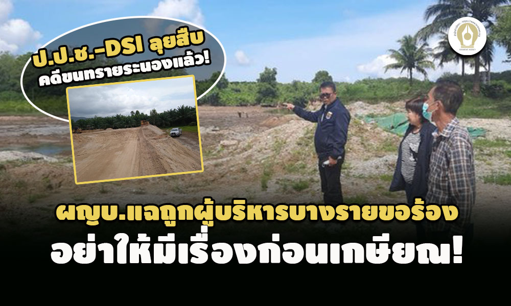 ป.ป.ช.-ดีเอสไอ ลงพื้นที่ระนองสืบสวนคดีขนทรายออกจากพื้นที่จับกุมรุกป่าชายเลนแล้ว ผู้ใหญ่บ้านแฉมีผู้บริหารบางรายมาขอร้องอย่าให้มีเรื่องก่อนเกษียณอายุราชการ - จ่อแจ้งข้อกล่าวหาจนท.ที่เกี่ยวข้อง ไม่น้อยกว่า 5 ราย