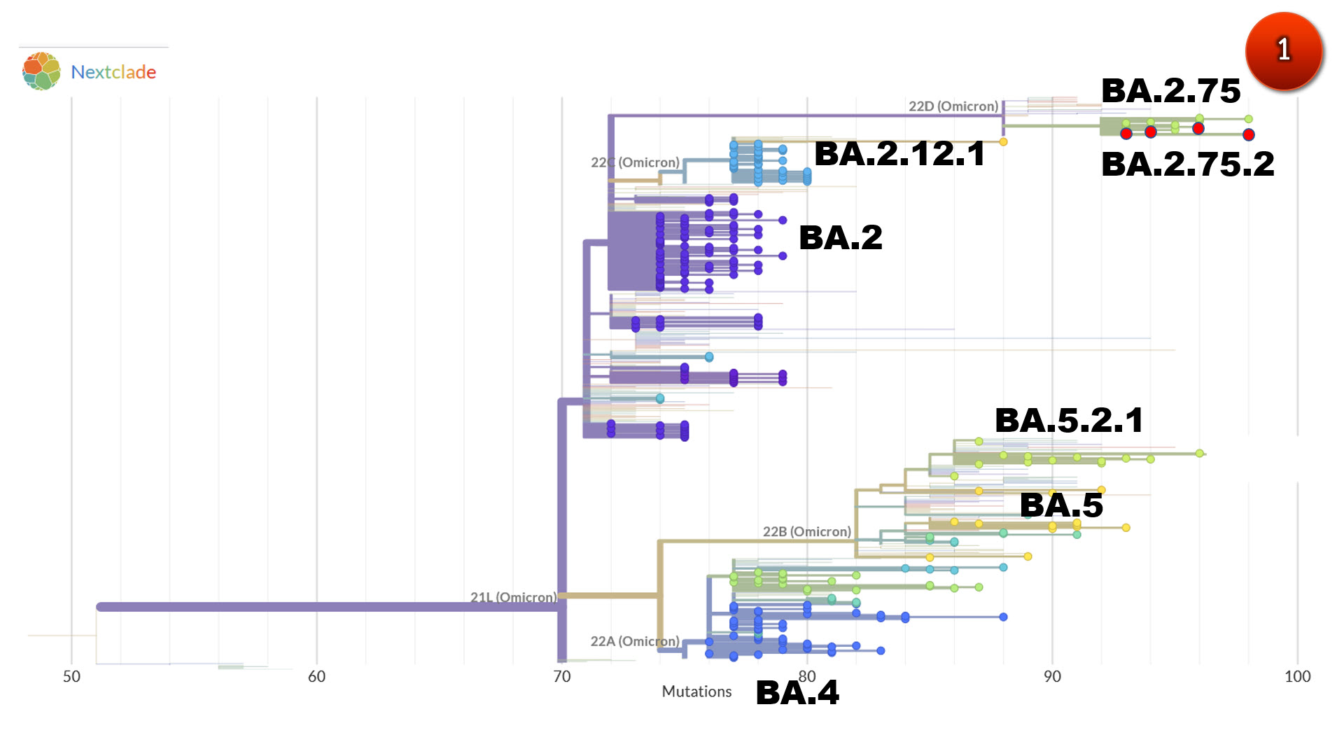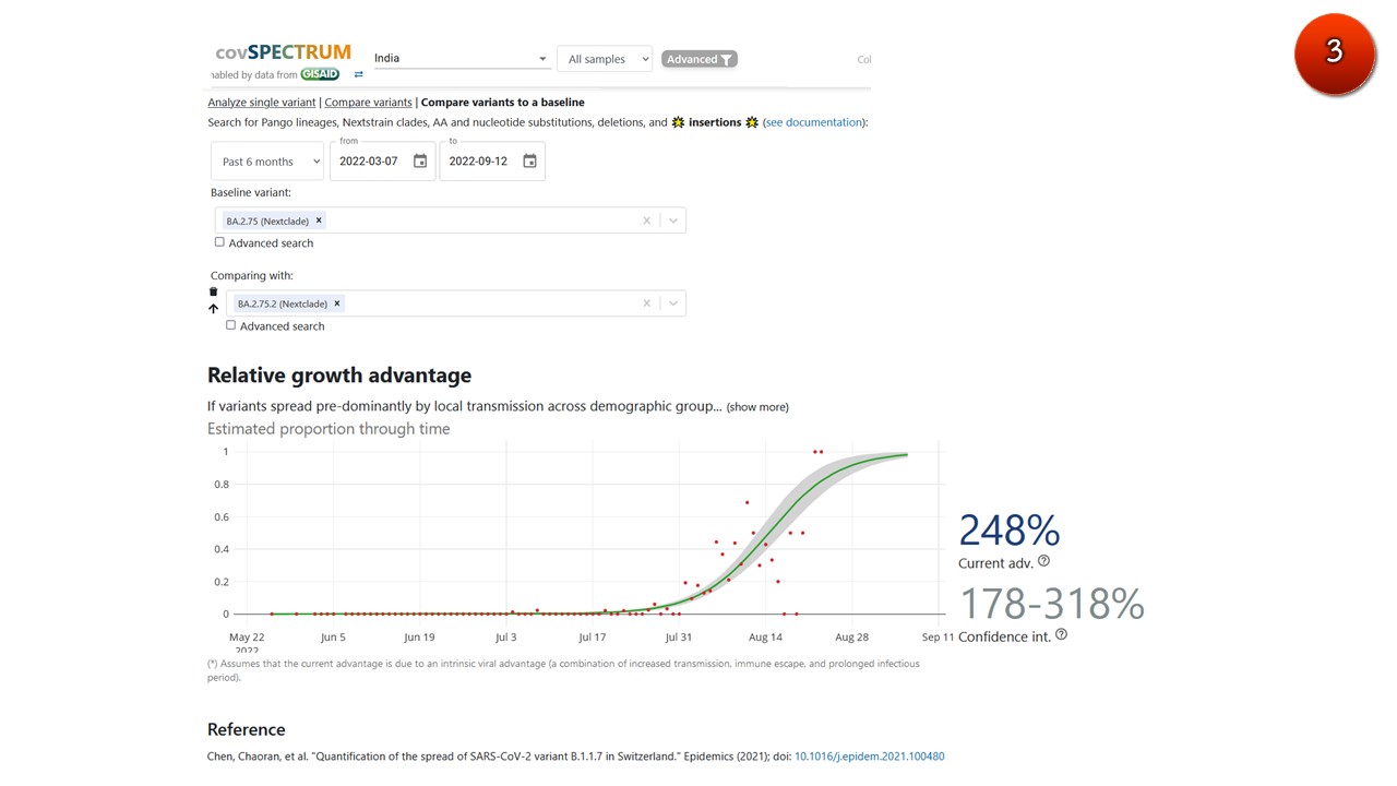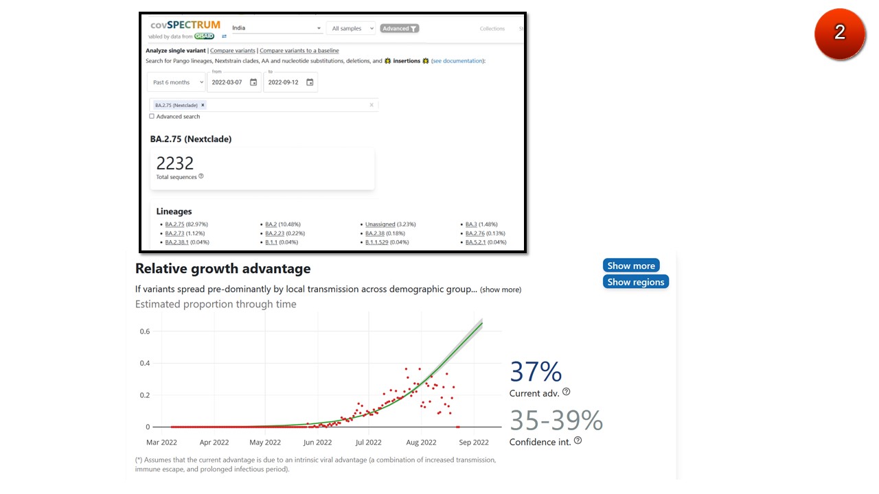 โอไมครอน BA.2.75 กลายพันธุ์มาจาก BA.2 ถือได้ว่าเป็นเจเนอเรชัน 2 ( 2nd generation) โดยมีการกลายพันธุ์ต่างจากไวรัสดั้งเดิม (อู่ฮั่น) 95-100 ตำแหน่ง มีความได้เปรียบในการเติบโต-แพร่ระบาด (relative growth advantage) ประมาณ 37% เมื่อเปรียบเทียบกับสายพันธุ์อื่นที่ระบาดอยู่ในอินเดียในปัจจุบัน (ภาพ1,2)