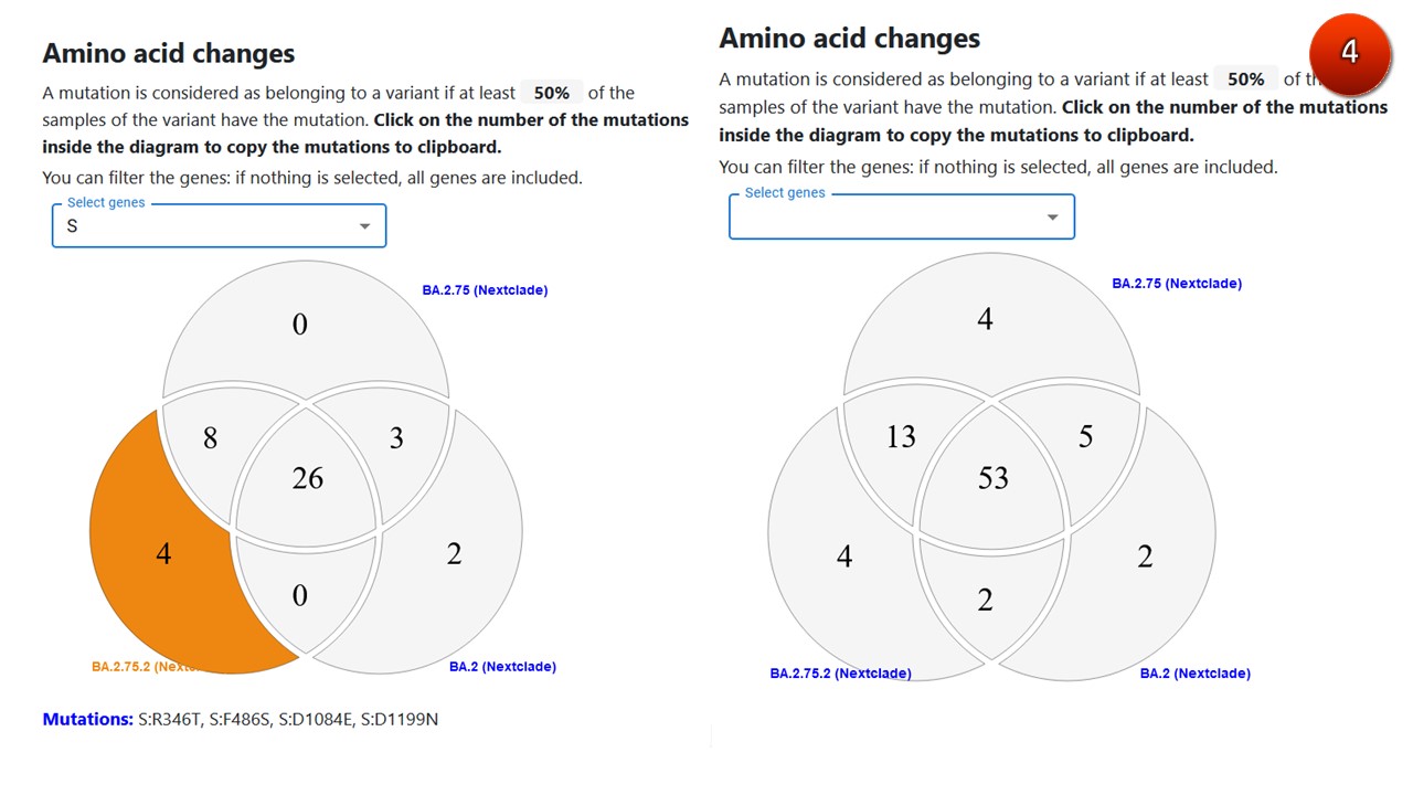 โอไมครอน BA.2.75.2 มีการกลายพันธุ์บริเวณส่วนหนาม 3 ตำแหน่งที่ต่างไปจากโอไมครอน BA.2 และ BA.2.75 คือ S:R346T, S:F486S, S:D1199N (ภาพ 4) สามารถใช้เป็นตำแหน่งตรวจกรองด้วยการถอดรหัสพันธุกรรม หรือการตรวจด้วย PCR