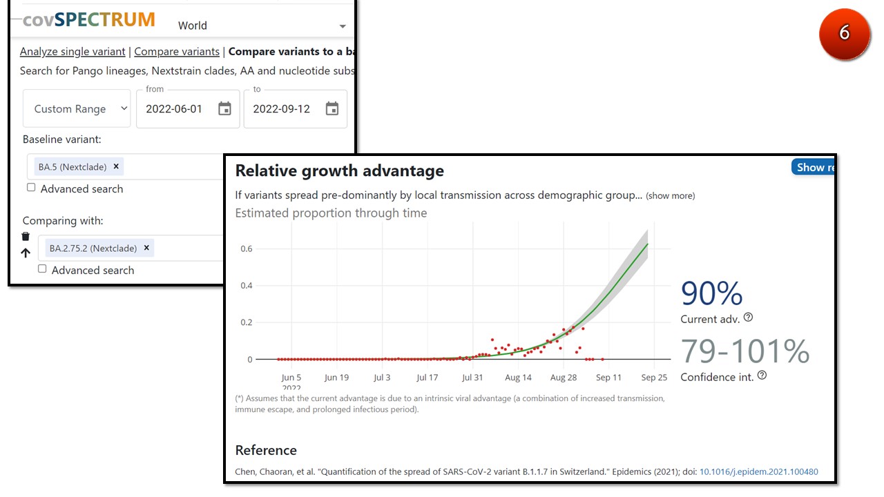 จากการสืบค้นจากฐานข้อมูลรหัสพันธุกรรมโควิดโลก “GISAID” พบ “โอไมครอน BA.2.75.2 จากประเทศไทยที่อัปโหลดขึ้นมาบน GISAID เพียงรายเดียว” ยังไม่สามารถคำนวณความได้เปรียบในการเติบโต-แพร่ระบาด (relative growth advantage) เปรียบเทียบกับโอไมครอน BA.4 และ BA.5 ที่ระบาดในประเทศไทยได้เพราะจำนวนตัวอย่าง BA.2.75.2 ในประเทศไม่มากพอ (ภาพ5)
