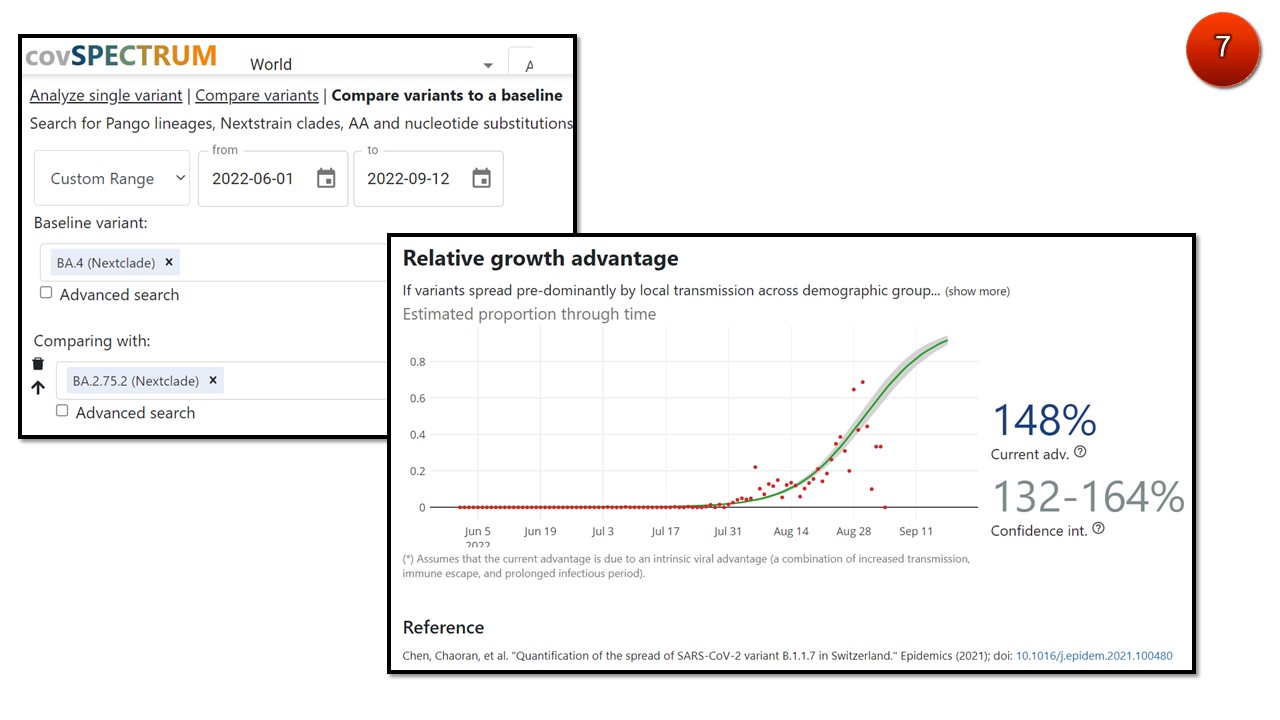 โอไมครอน BA.2.75.2 มีความได้เปรียบในการเติบโต-แพร่ระบาด (relative growth advantage) ถึง 90% เมื่อเปรียบเทียบกับ BA.5 (ภาพ 6) และ 148% เมื่อเปรียบเทียบกับ BA.4 ที่ระบาดอยู่ทั่วโลก (ภาพ 7)