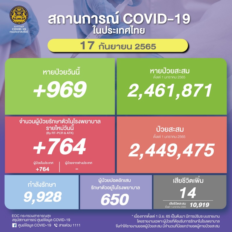 ส่วนการรักษา มีผู้หายป่วยกลับบ้านเพิ่ม 969 ราย ยอดหายป่วยสะสม (ตั้งแต่ 1 มกราคม 2565) 2,461,871 ราย อยู่ระหว่างรักษาตัว 9,928 ราย