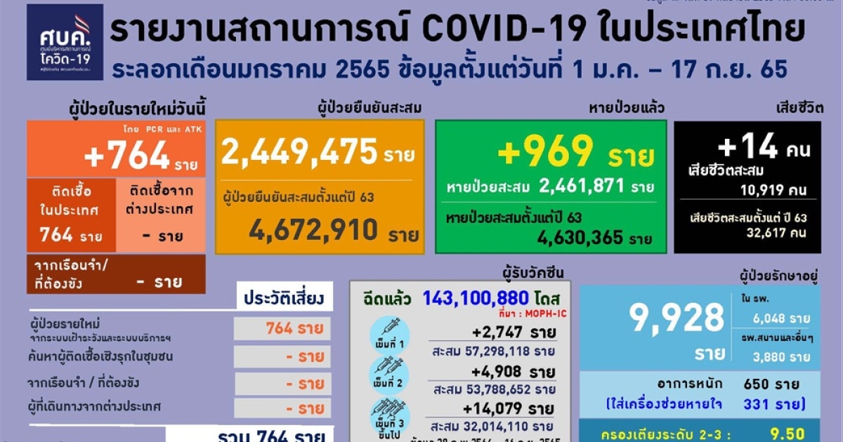 ไทยป่วยโควิดเพิ่ม 764 ราย อาการหนัก 650 ราย ขณะที่หายกลับบ้าน 969 ราย เสียชีวิตเพิ่ม 14 ราย ยังไม่ได้ฉีดเข็มกระตุ้น 13 ราย