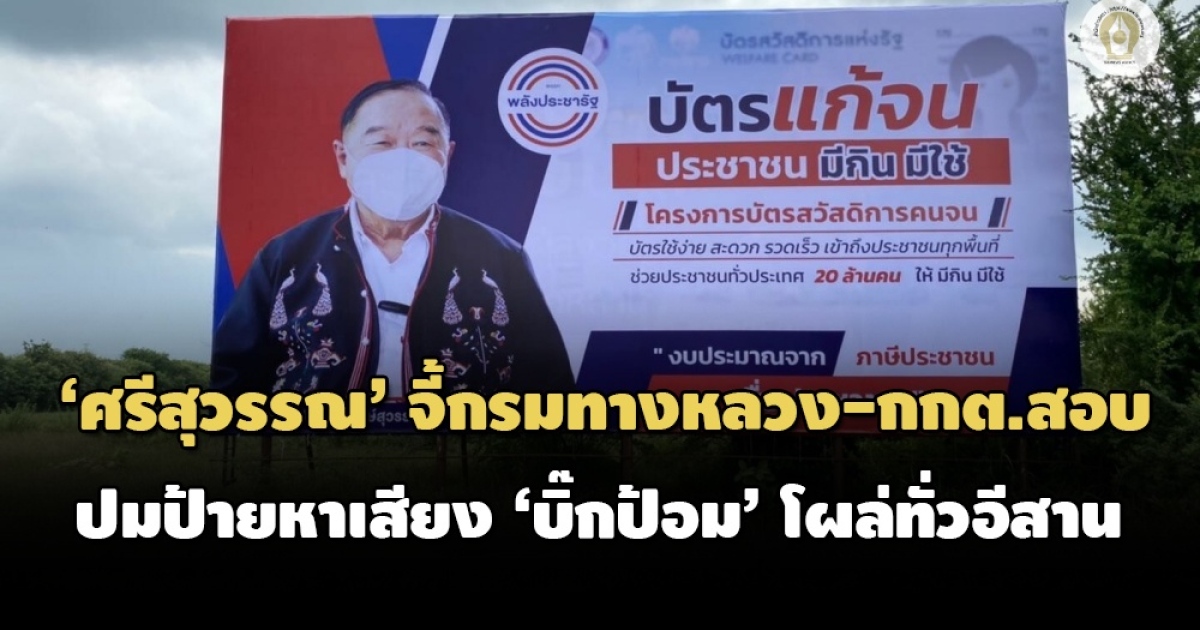 'ศรีสุวรรณ' จี้ กรมทางหลวงสอบทั่ว ปท. หลังพบป้ายหาเสียง 'บิ๊กป้อม' ประชาสัมพันธ์ผลงานทั่วภาคอีสานก่อนยุบสภา สงสัยขอกรมทางหลวงแล้วหรือไม่ เล็งยื่่น กกต.สอบ ป้ายหาเสียงพรรคการเมืองอื่นด้วย