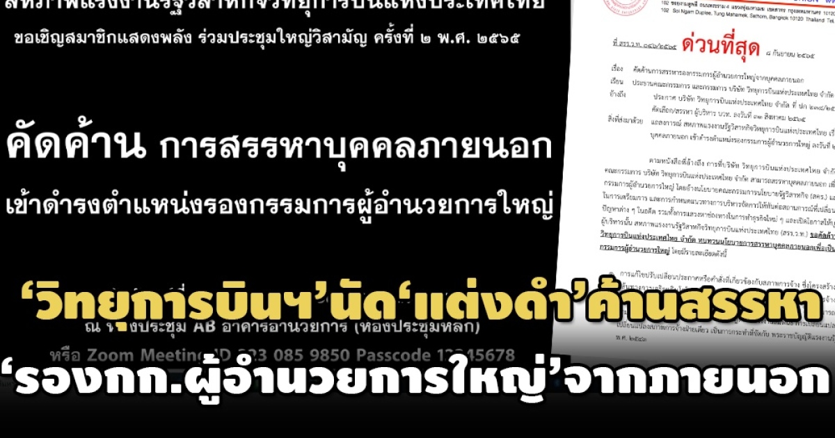 สำนักข่าวอิศรา (www.isranews.org) รายงานว่า ในวันพรุ่งนี้ (19 ก.ย.) สหภาพแรงงานรัฐวิสาหกิจวิทยุการบินแห่งประเทศไทย (สรร.ว.ท.) จะมีการจัดประชุมใหญ่วิสามัญ ครั้งที่ 2/2565 ทั้งนี้ ในการประชุมดังกล่าว สรร.ว.ท. ได้นัดหมายให้สมาชิกฯร่วมกันแต่งชุดดำ เพื่อคัดค้านกรณีคณะกรรมการ บริษัท วิทยุการบินแห่งประเทศไทย จำกัด (บวท.) ยังคงเดินหน้านโยบายสรรหาผู้บริหารระดับสูงตำแหน่ง รองกรรมการผู้อำนวยการใหญ่ จากบุคคลภายนอก