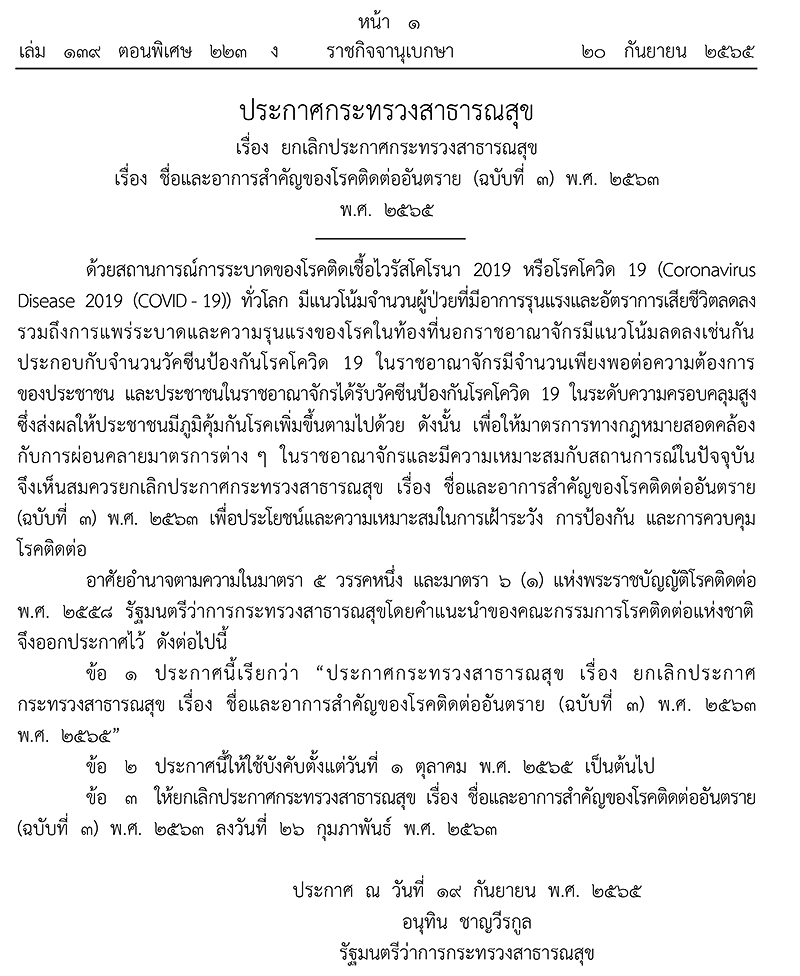 ดังนั้น เพื่อให้มาตรการทางกฎหมายสอดคล้องกับการผ่อนคลายมาตรการต่างๆ และมีความเหมาะสมกับสถานการณ์ในปัจจุบัน จึงเห็นสมควรยกเลิกประกาศกระทรวงสาธารณสุข เรื่อง ชื่อและอาการสำคัญของโรคติดต่ออันตราย (ฉบับที่ 3) พ.ศ.2563 (โรคโควิด-19) เพื่อประโยชน์และความเหมาะสมในการเฝ้าระวัง ป้องกัน และควบคุมโรคติดต่อ ทั้งนี้ให้ใช้บังคับตัง้แต่ 1 ต.ค.2565 เป็นต้นไป