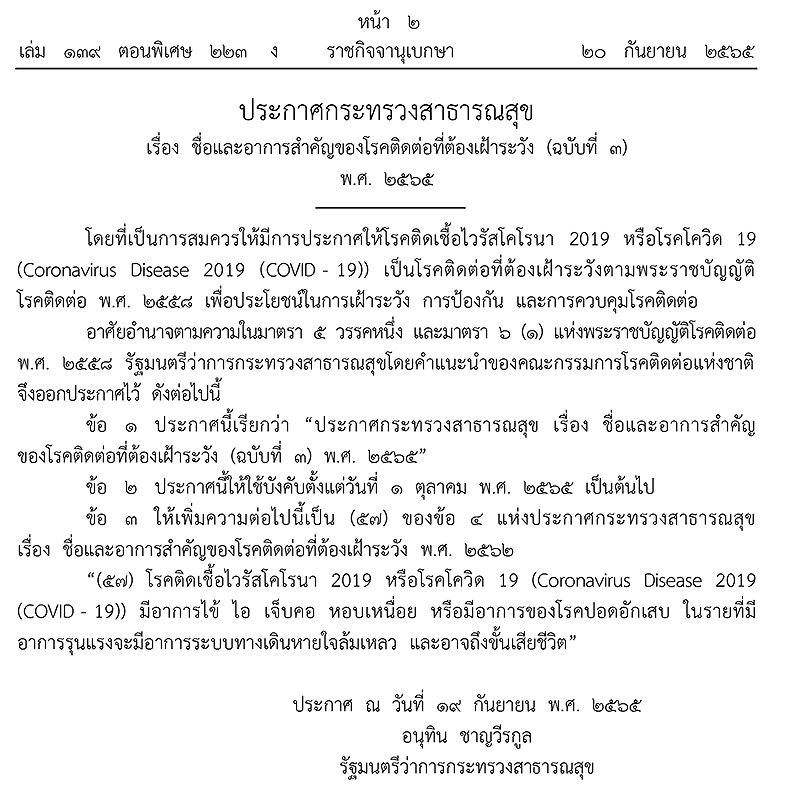 ราชกิจจานุเบกษา แพร่ประกาศกระทรวงสาธารณสุข ยกเลิก โควิด เป็นโรคติดต่ออันตราย เปลี่ยนเป็นโรคติดต่อที่ต้องเฝ้าระวัง มีผลตั้งแต่ 1 ต.ค.2565