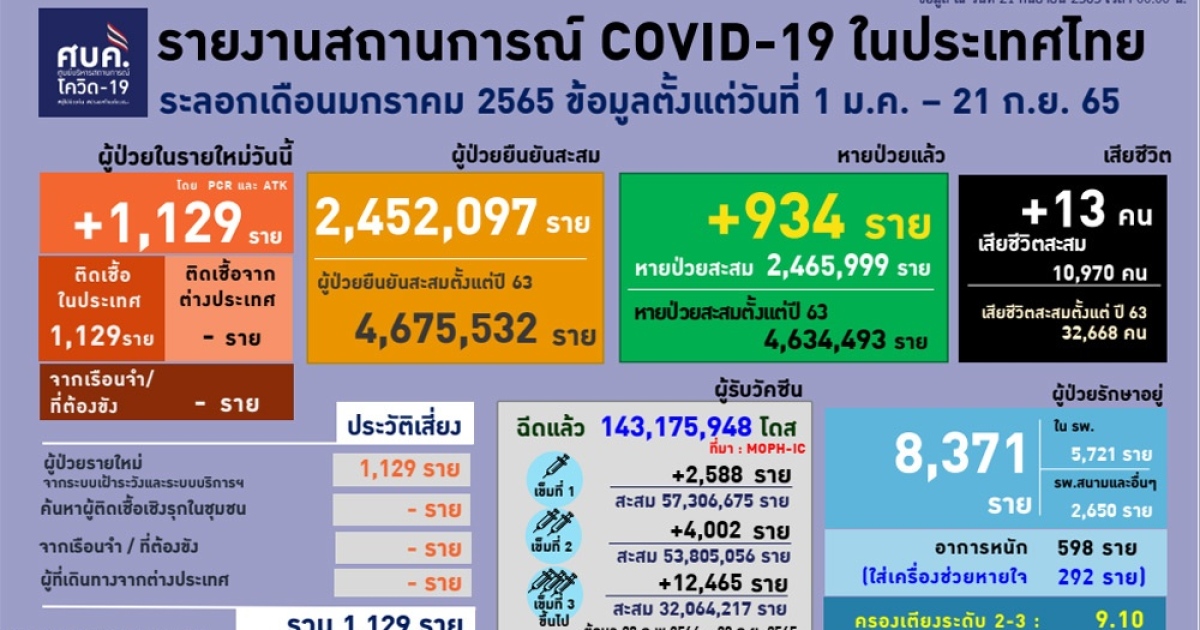 สำนักข่าวอิศรา รายงานสถานการณ์แพร่ระบาดของโรคโควิด-19 ประเทศไทยประจำวันที่ 21 ก.ย.2565 ว่า มีจำนวนผู้ติดเชื้อใหม่ 1,129 ราย เป็นผู้ป่วยในประเทศทั้งหมด