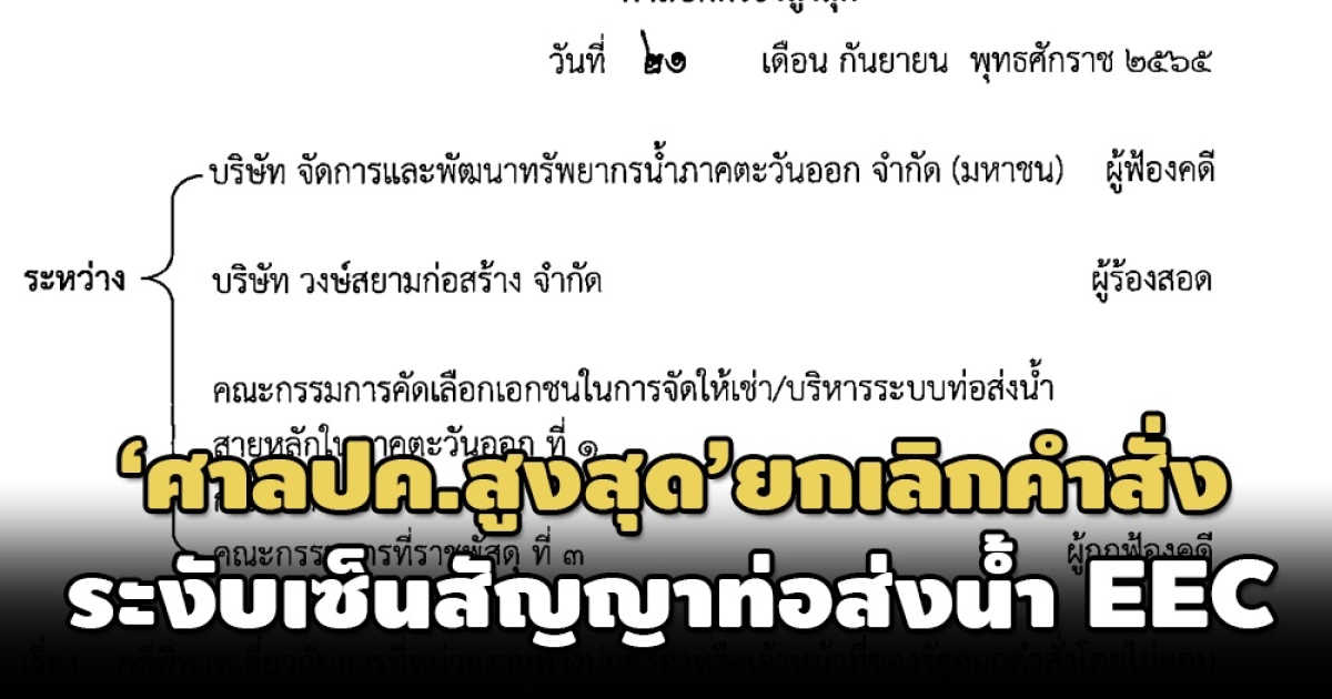 ‘ศาลปกครองสูงสุด’ มีคำสั่ง ‘ยกเลิก’ คำสั่งทุเลาการบังคับ คดีระงับลงนามสัญญาโครงการท่อส่งน้ำ EEC เปิดทาง ‘กรมธนารักษ์’ เซ็นสัญญากับผู้ชนะการประมูลได้