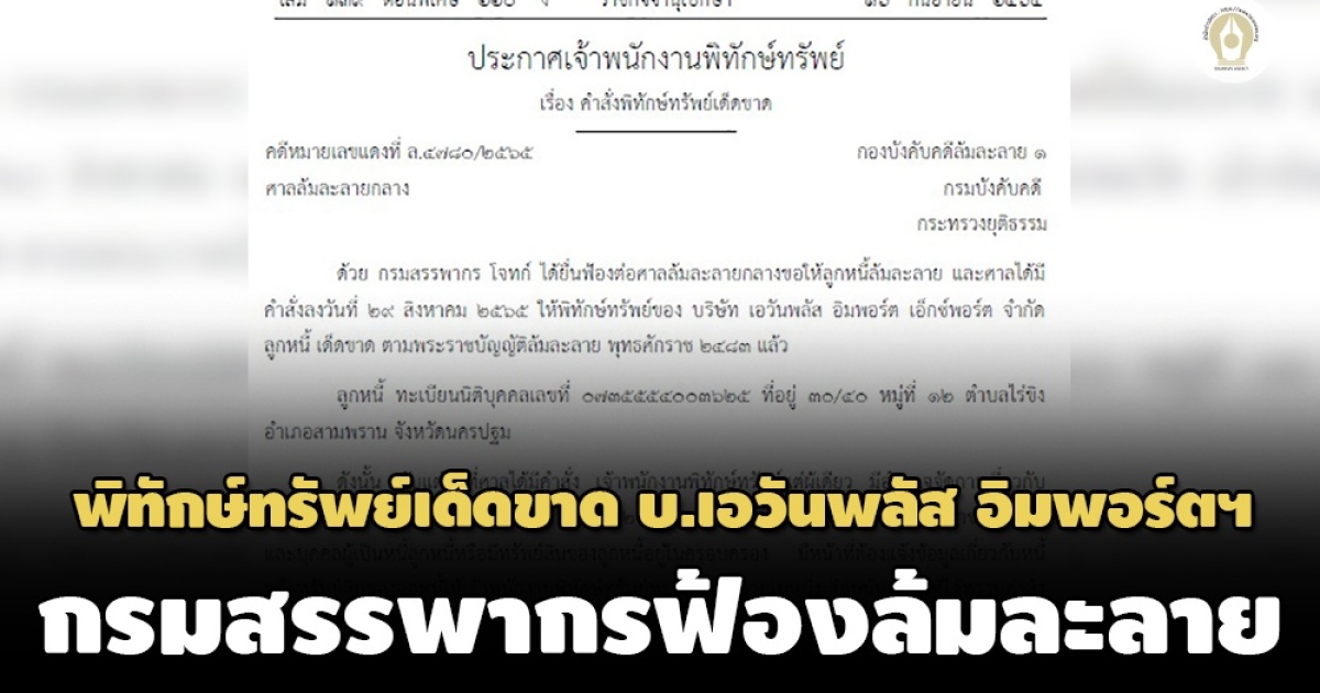 แพร่ประกาศ ศาลล้มละลายสั่งพิทักษ์ทรัพย์ บ.เอวันพลัส อิมพอร์ต เอ็กซ์พอร์ต เด็ดขาด กรมสรรพากร โจทก์ ฟ้องล้มละลาย จดทะเบียนจัดตั้งในพื้นที่ จ.นครปฐม ขายชิ้นส่วนคอมพิวเตอร์ โยงคืนภาษีมูลค่าเพิ่มกลุ่ม 2 พันล.