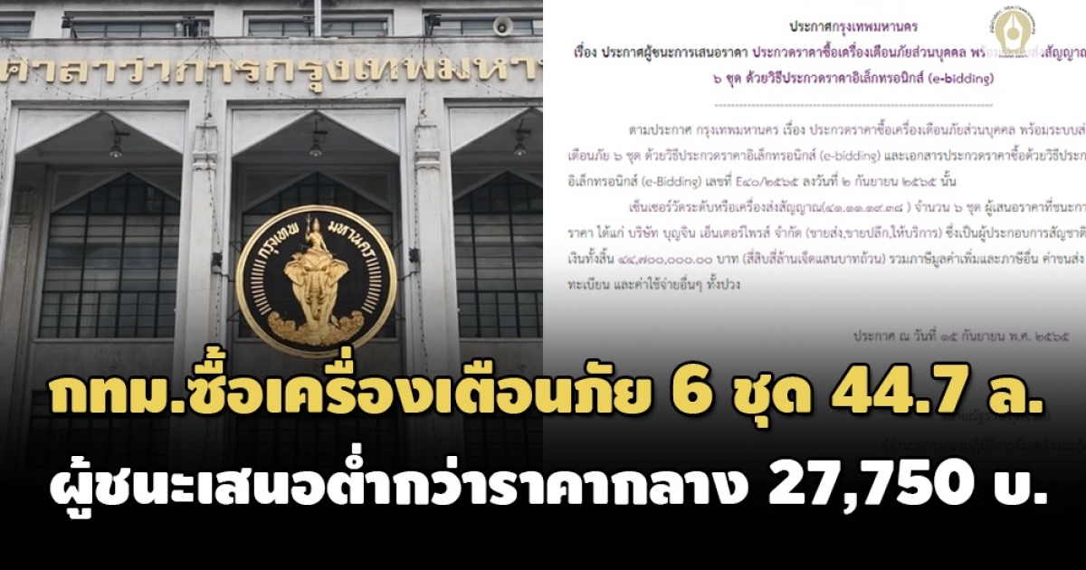 กทม.ออกเอกสารเชิญชวนจัดซื้อเครื่องเตือนภัยส่วนบุคคล พร้อมระบบส่งสัญญาณ 6 ชุด 44.7 ล้าน 2 ก.ย.2565 ผลเอกชนผู้ชนะเสนอต่ำกว่าราคากลาง 27,750 บาท ประกาศชื่อแล้วเมื่อ 15 ก.ย.