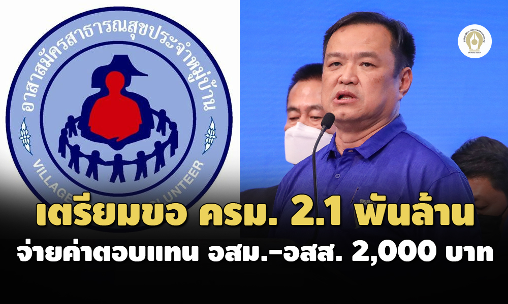 ผู้สื่อข่าวรายงานว่า เมื่อวันที่ 26 ก.ย.2565 น.ส.ไตรศุลี ไตรสรณกุล รองโฆษกประจำสำนักนายกรัฐมนตรี กล่าวว่า นายอนุทิน ชาญวีรกูล รองนายกรัฐมนตรี และ รมว.สาธารณสุข เตรียมเสนอคณะรัฐมนตรี (ครม.) ในวันที่ 27 ก.ย. เพื่อพิจารณาอนุมัติงบประมาณรายจ่ายปี 2565 งบกลาง รายการเงินสำรองจ่ายเพื่อกรณีฉุกเฉินหรือจำเป็น จำนวน 2,100.61 ล้านบาท เพื่อเป็นค่าตอบแทนให้แก่อาสาสมัครสาธารณสุขประจำหมู่บ้าน (อสม.) และอาสาสมัครสาธารณสุขกรุงเทพมหานคร (อสส.) รวม 1,050,306 คน ช่วงเดือน มิ.ย. – ก.ย. 65 รวม 4 เดือน ในอัตรา 500 บาทต่อคนต่อเดือน รวมเป็น 2,000 บาทต่อคน