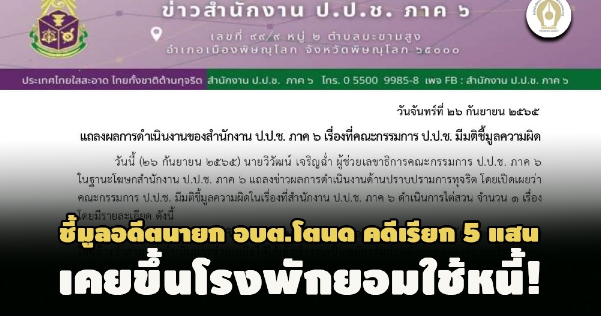 สำนักงาน ป.ป.ช.ภาค 6 แพร่มติ ป.ป.ช. ชี้มูลความผิด 'วิเชียร สุทธิวิลัย' อดีตนายก อบต.โตนด อำเภอคีรีมาศ สุโขทัย เรียกรับเงิน 5 แสนบาท แลกช่วยเหลือให้ได้เข้าทำงานพนง.ส่วนตำบล มีหลักฐานขึ้นโรงพักลงบันทึกประจำวันยอมชดใช้หนี้ ก่อนเบี้ยวหลังจ่ายคืนได้แค่ 3 งวด