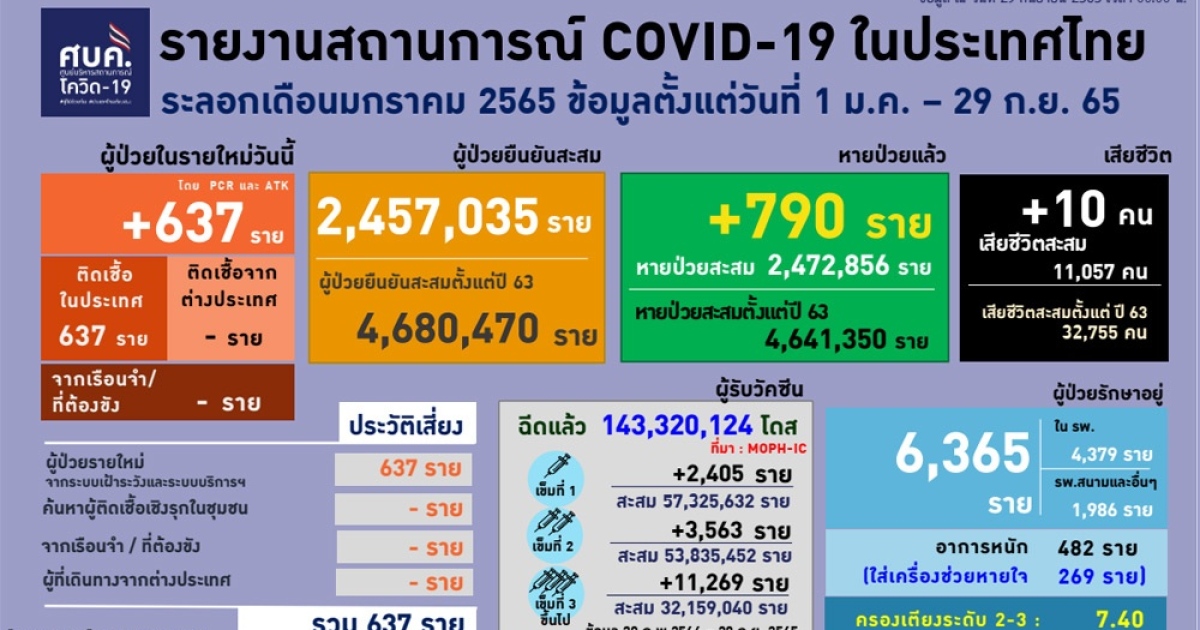 สำนักข่าวอิศรา (www.isranews.org) รายงานว่า เมื่อวันที่ 29 ก.ย. 2565 ศูนย์บริหารสถานการณ์โควิด-19 (ศบค.) รายงานสถานการณ์ประจำวัน โดยพบผู้ป่วยรายใหม่ 637 ราย จากระบบเฝ้าระวังและระบบบริการฯ ไม่มีรายงานผู้ติดเชื้อในเรือนจำและจากต่างประเทศ รวมผู้ป่วยสะสม 4,680,470 ราย