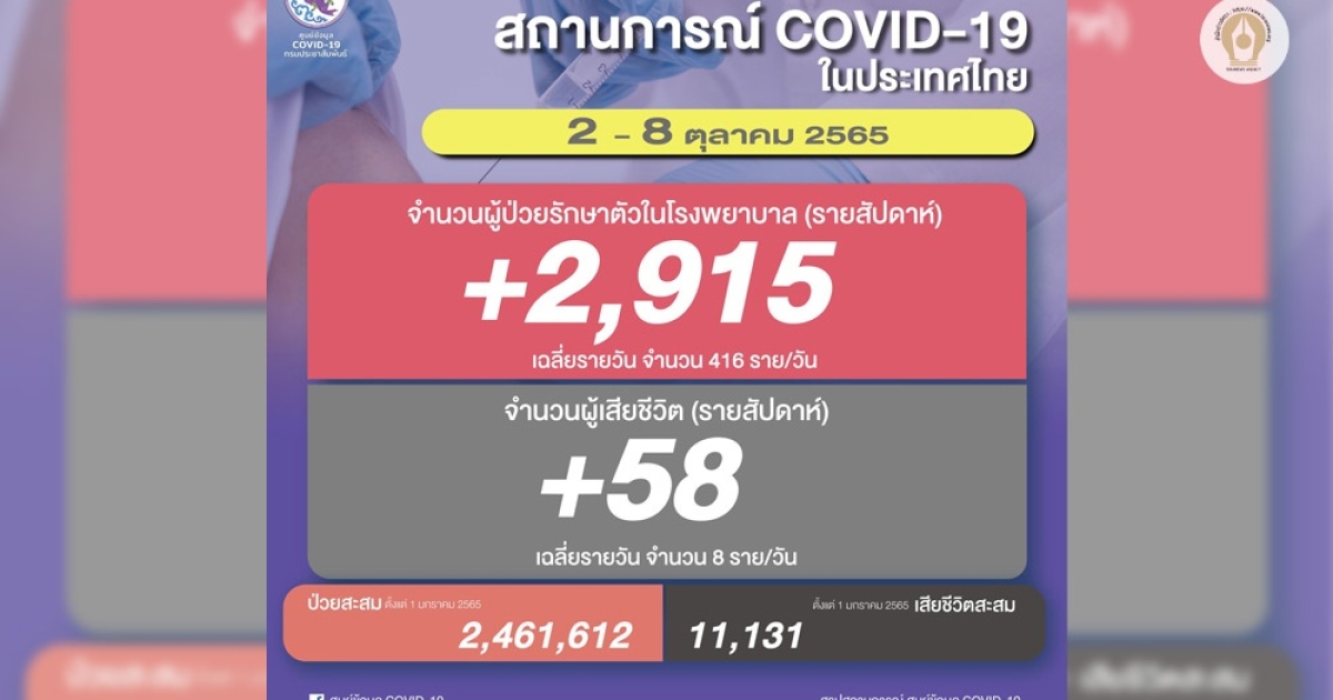 สำนักข่าวอิศรา (www.isranews.org) รายงานสถานการณ์แพร่ระบาดของโรคโควิด-19 ประเทศไทย ประจำสัปดาห์ ระหว่างวันที่ 2-8 ต.ค. 2565 มีจำนวนผู้ติดเชื้อใหม่เข้ารักษาตัวโรงพยาบาล2,915 ราย เฉลี่ยวันละ 416 ราย ทำให้จำนวนผู้ติดเชื้อสะสมอยู่ที่ 2,461,612 ราย (ตั้งแต่ 1 ม.ค. 2565)