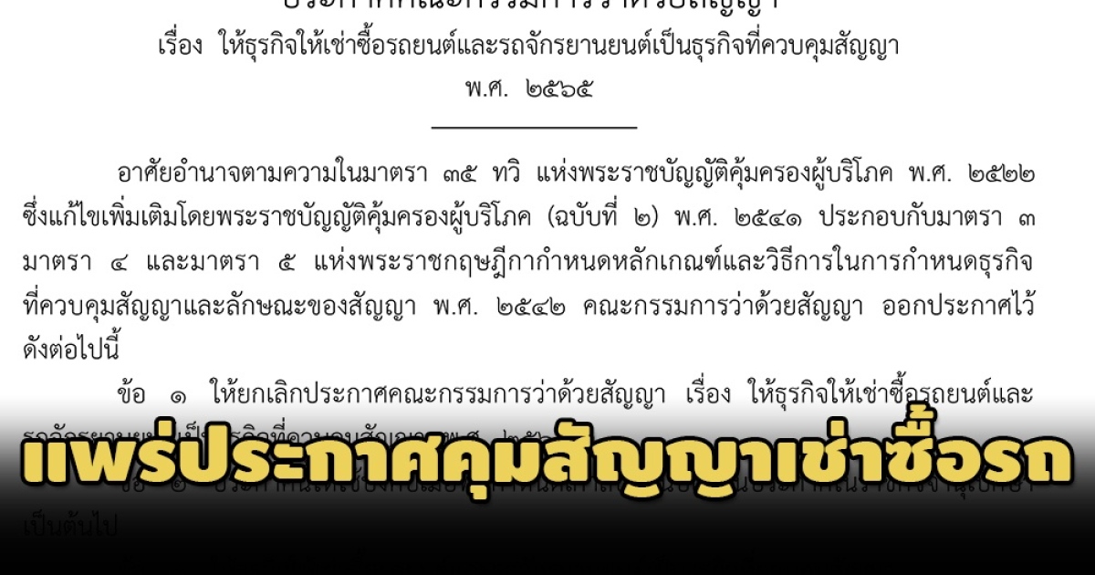 สำนักข่าวอิศรา (www.isranews.org) รายงานว่า เมื่อวันที่ 12 ต.ค.ที่ผ่านมา เว็บไซต์ราชกิจจานุเบกษาเผยแพร่ “ประกาศคณะกรรมการว่าด้วยสัญญา เรื่อง ให้ธุรกิจเช่าซื้อรถยนต์และรถจักรยานยนต์เป็นธุรกิจที่ควบคุมสัญญา พ.ศ.2565” เพื่อกำกับดูแลธุรกิจเช่าซื้อรถยนต์และรถจักรยานยนต์ โดยประกาศฉบับนี้ให้ใช้บังคับเมื่อพ้นกำหนด 90 วัน นับแต่วันประกาศในราชกิจจานุเบกษาเป็นต้นไป