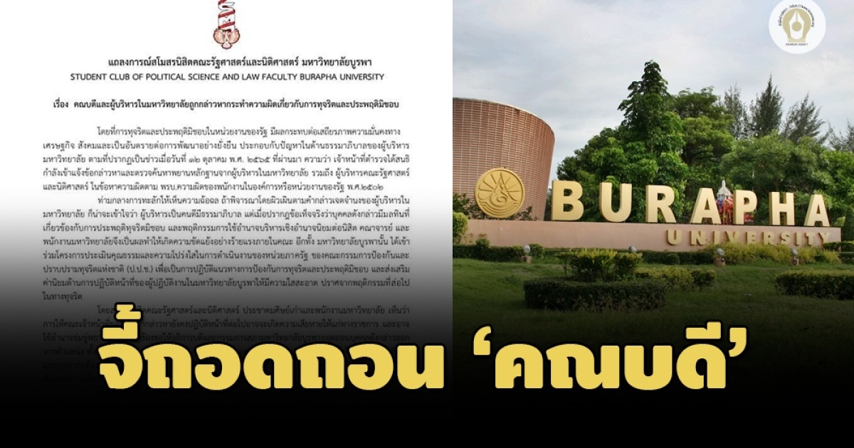 'สโมสรนิสิตคณะรัฐศาสตร์ ม.บูรพา'จี้ถอดถอนคณบดีรัฐศาสตร์-นิติศาสตร์ ถูก ปปป.ตั้งข้อหาทุจริตโครงการวิชาการ ชี้ปล่อยให้ปฏิบัติหน้าที่ต่ออาจเปิดช่องข่มขู่พยานได้