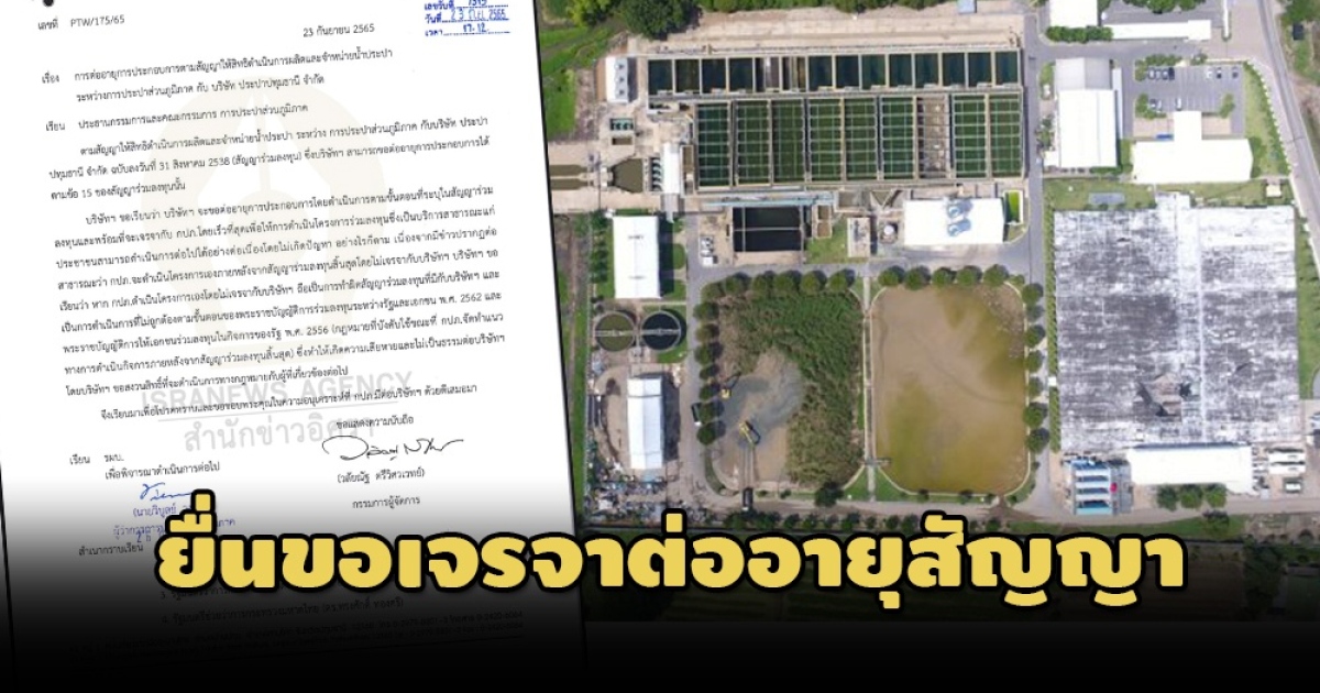 ‘บ.ประปาปทุมฯ’ ทำหนังสือถึง ‘บอร์ด กปภ.’ แจ้งขอเจรจา 'ต่ออายุ' สัญญาโครงการ ‘ประปาปทุมธานี-รังสิต’ อีก 10 ปี หลังสิ้นสุดสัญญา ต.ค.66 ระบุหาก ‘กปภ.’ ไม่เจรจากับบริษัทฯก่อน จะดำเนินการทางกฎหมาย