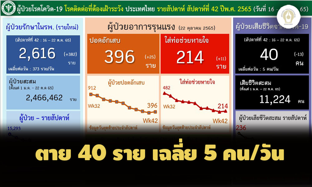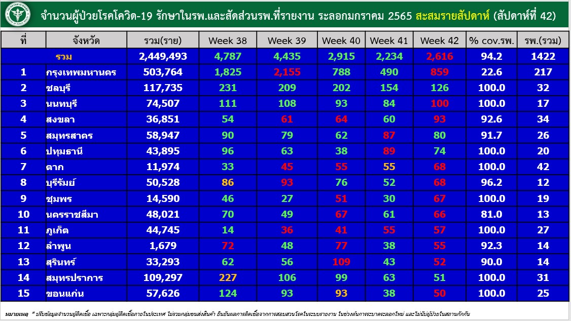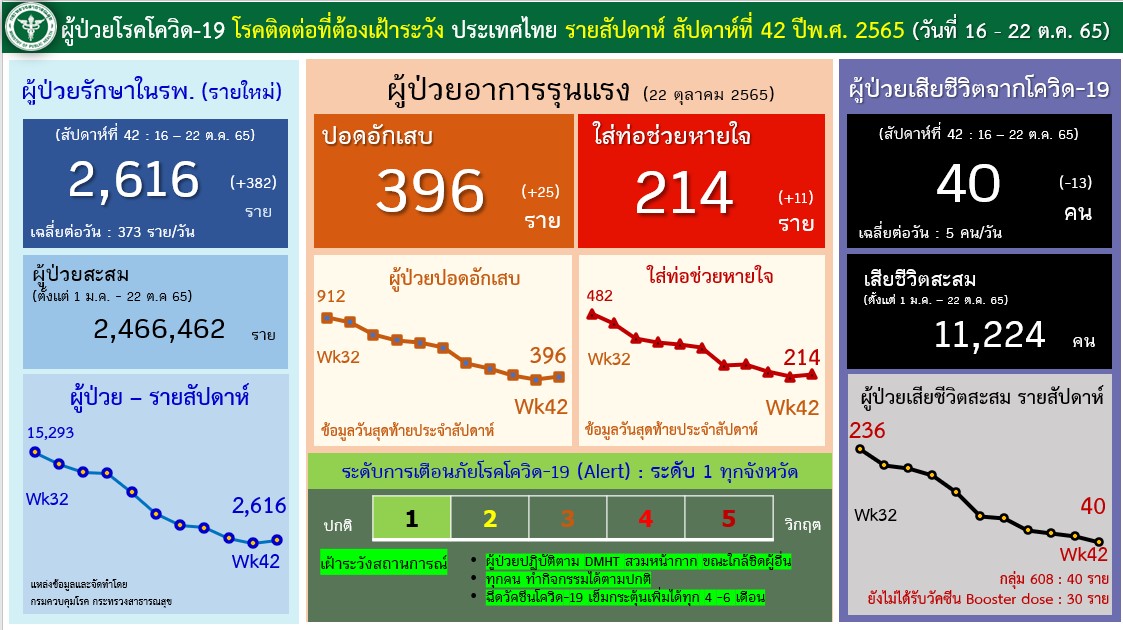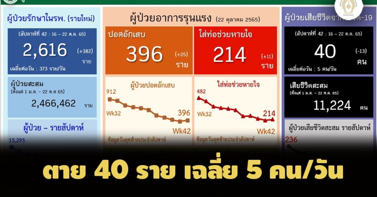 สำนักข่าวอิศรา (www.isranews.org) รายงานสรุปสถานการณ์โรคโควิด-19 ประจำสัปดาห์ที่ 42 วันที่ 16-22 ต.ค. 2565 ว่า มีผู้ป่วยรักษาในรพ.รายใหม่ 2,616 ราย (เฉลี่ย 373 ราย/วัน) แนวโน้มพบผู้ป่วยรายใหม่ เพิ่มขึ้น เทียบจากสัปดาห์ที่ 41