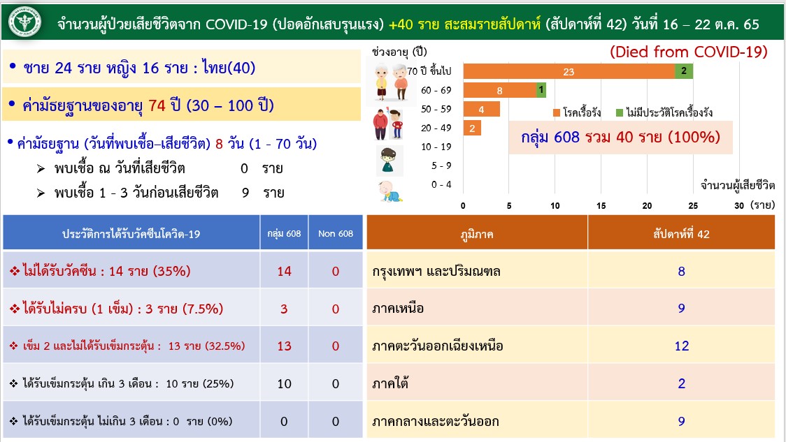 มีผู้เสียชีวิตเพิ่ม : Died from COVID 40 ราย (เฉลี่ย 5 คน/วัน) กลุ่ม 608 จำนวน 40 ราย (ร้อยละ 100)