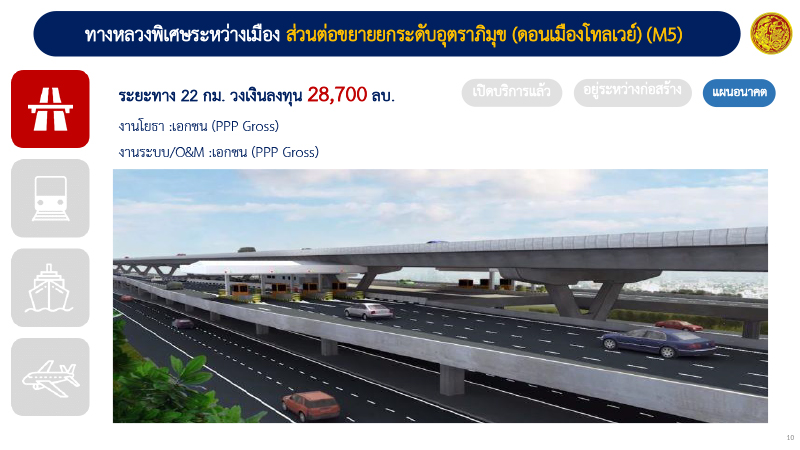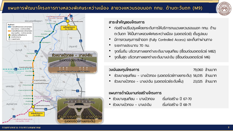 และ 4. โครงการมอเตอร์เวย์ช่วงบางขุนเทียน - บางบัวทอง (M9) หรือวงแหวนตะวันตก ระยะทาง 36 กม. วงเงิน 56,035 ล้านบาท ปัจจุบันผ่านการพิจารณาของ บอร์ด PPP แล้ว ขั้นตอนหลังจากนี้มีเพียงการเสนอให้ที่ประชุม ครม. เห็นชอบ โดยรูปแบบการลงทุนที่วางไว้เป็นแบบ PPP Net Cost (เอกชนจะเป็นผู้ลงทุนก่อสร้าง งานระบบและจัดเก็บค่าผ่านทาง (O&M) ขณะที่ภาครัฐจะเป็นผู้ดำเนินการเวนคืนที่ดิน) อายุสัญญาสัมปทาน 30 ปี คาดว่าจะเริ่มดำเนินการก่อสร้างในปี 2567 แล้วเสร็จในปี 2570