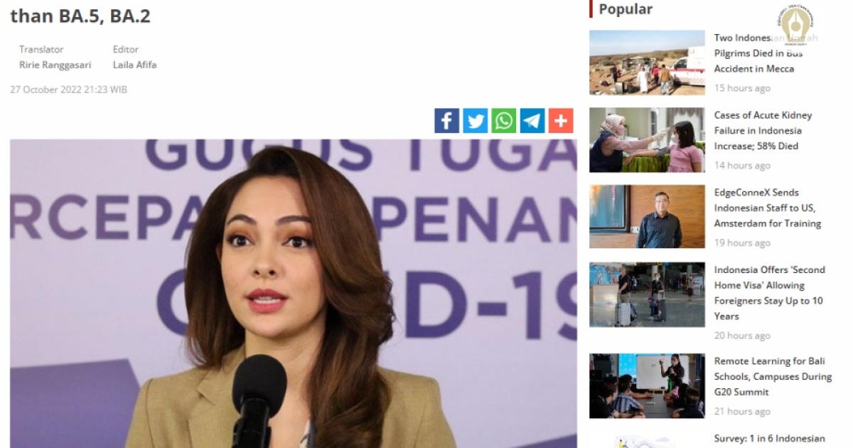 'อินโดนีเซีย' เผยข้อมูลโอไมครอน XBB ระบาดได้เร็วกว่า BA.5 0.79 เท่า ระบาดเร็วกว่า BA.2 0.46 เท่า แต่อาการป่วยยังไม่รุนแรง สอดคล้องข้อมูล WHO ยังไม่พบผู้เสียชีวิตอย่างมีนัยยะสำคัญ