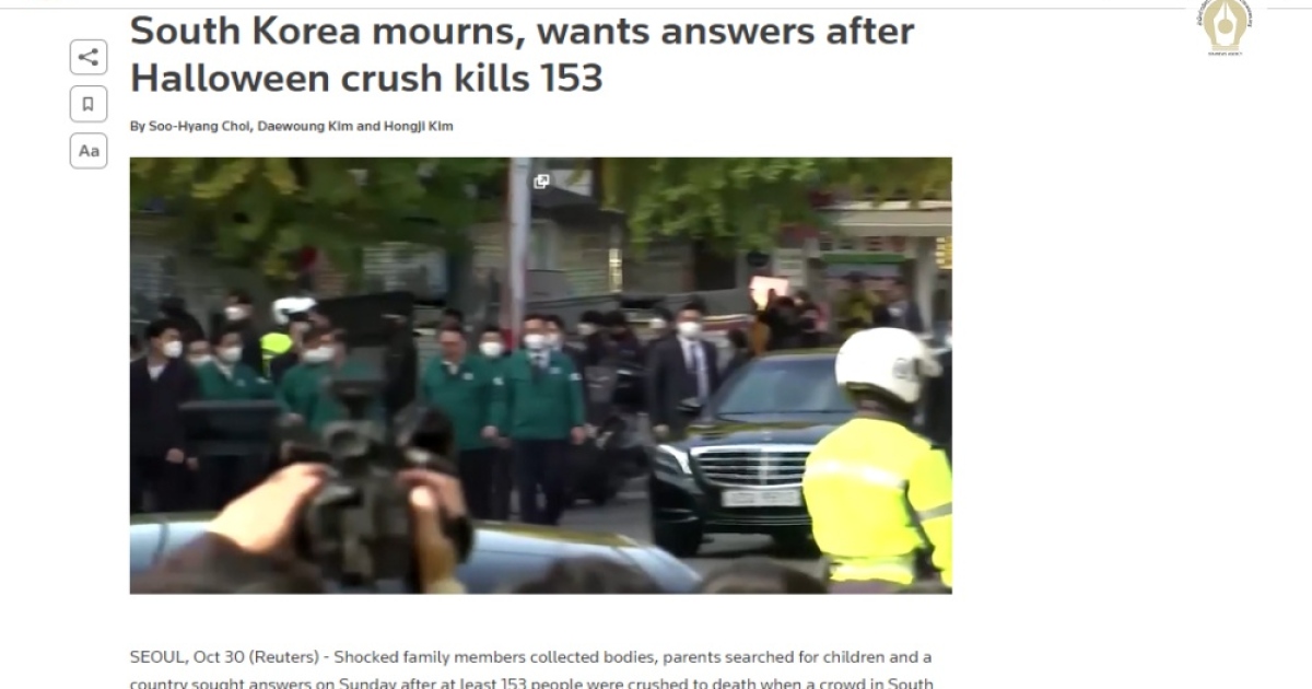 สำนักข่าวอิศรา (www.isranews.org) รายงานข่าวเกี่ยวกับเหตุการณ์เหยียบกันครั้งใหญ่ที่เทศกาลวันฮาโลวีนในเขตอิแทวอน กรุงโซล ของเกาหลีใต้จนทำให้มีผู้บาดเจ็บและเสียชีวิตจำนวนมากว่า ล่าสุดมีรายงานข่าวว่า ยอดผู้เสียชีวิตนั้นแตะที่ 153 รายแล้ว และมีผู้บาดเจ็บอีก 82 ราย โดยในจำนวนผู้เสียชีวิตดังกล่าวนั้นพบว่ามีชาวต่างชาติเสียชีวิตอีก 22 ราย สูญหายอีกนับพันราย โดยผู้เสียชีวิตนั้นแบ่งออกเป็นผู้ชาย 56 ราย และผู้หญิง 97 ชาวต่างชาติที่เสียชีวิตนั้นพบว่ามีอาทิ ชาวนอร์เวย์,อุซเบกิสถาน,อิหร่าน,และจีน