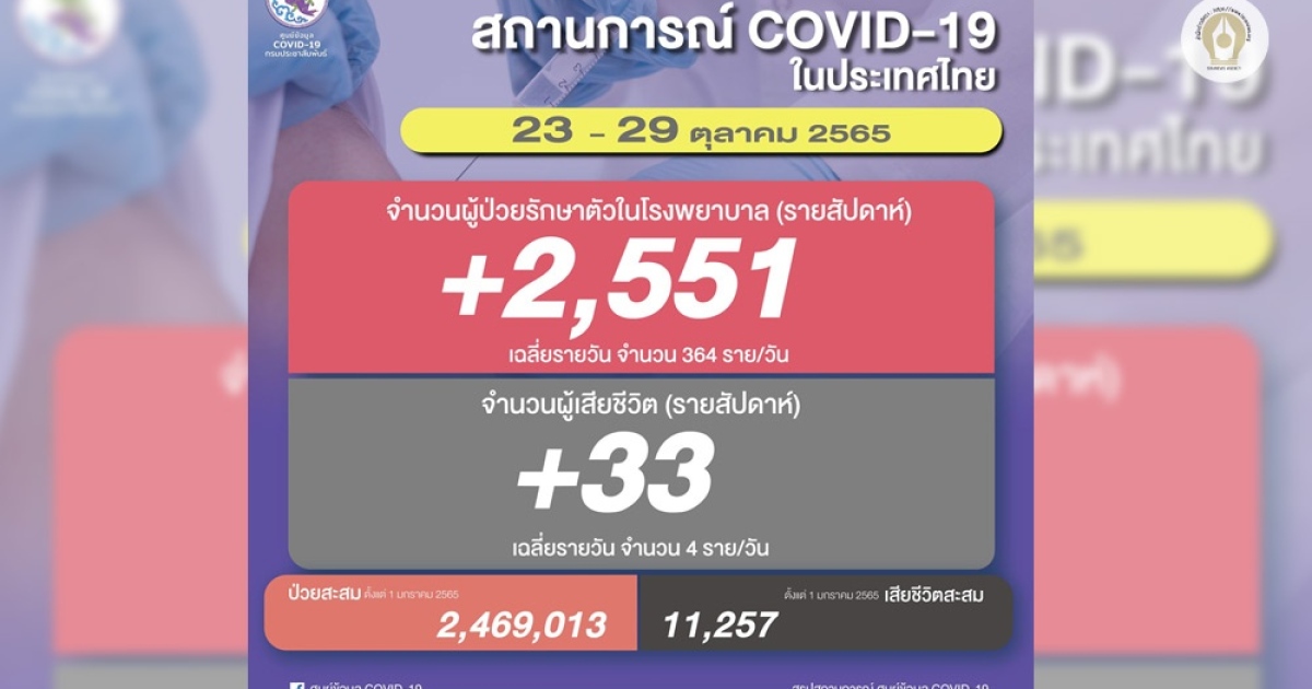 สถานการณ์โควิดไทย สัปดาห์ล่าสุด 23 - 29 ต.ค.2565 ติดเชื้อเข้ารักษาใน รพ.ใหม่ 2,551 ราย เสียชีวิต 33 ราย อาการหนัก 320 ราย ฉีดวัคซีนแล้ว 142.89 ล้านโดส