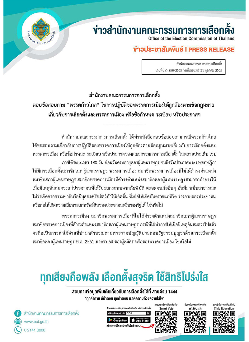 สำนักข่าวอิศรา (www.isranews.org) รายงานว่า วันที่ 31 ตุลาคม 2565 สำนักงานคณะกรรมการการเลือกตั้ง (กกต.)ได้ทำหนังสือตอบข้อสอบถาม กรณีพรรคก้าวไกลได้ขอสอบถามเกี่ยวกับการปฏิบัติของพรรคการเมืองให้ถูกต้องตามข้อกฎหมายเกี่ยวกับการเลือกตั้งและพรรคการเมือง หรือข้อกำหนด ระเบียบ หรือประกาศของคณะกรรมการการเลือกตั้ง ในหลายประเด็น เช่น