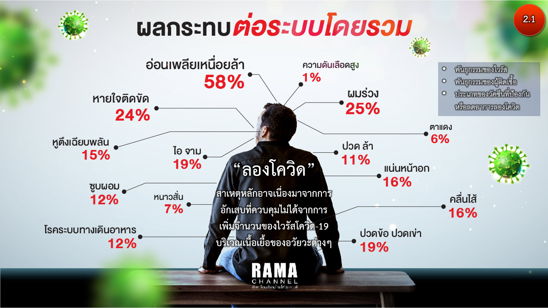 ศูนย์ควบคุมโรคติดต่อสหรัฐอเมริกา (Centers for Disease Control and Prevention, CDC) พบว่าสภาวะอาการหลังโควิด-19 มีการเจ็บป่วยด้วยอาการที่หลากหลายมากกว่า 200 อาการ (ภาพ 2.1) อาการบางอย่างสั้นบ้างอาการยาวแล้วแต่ละบุคคล เกิดได้แม้ในผู้ใหญ่สุขภาพสมบรูณ์ที่ไม่มีโรคประจำตัวเรื้อรัง โดยมีอาการป่วยคล้าย ME/CFS