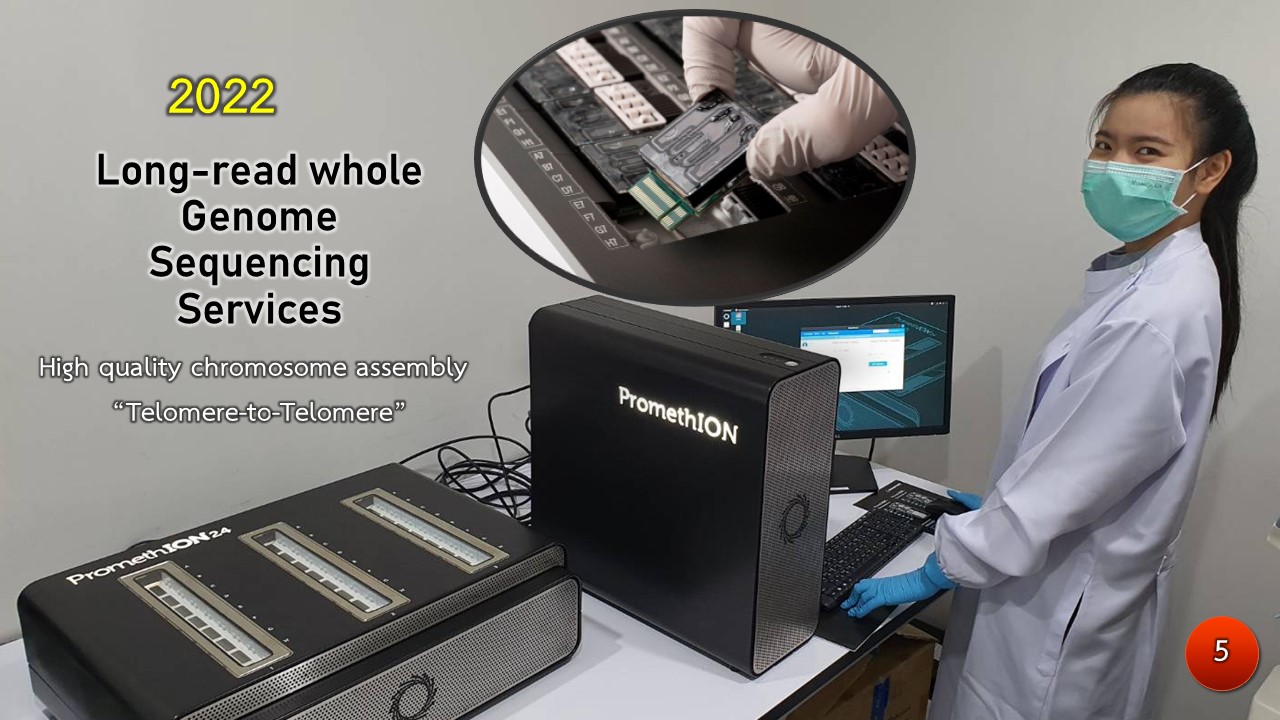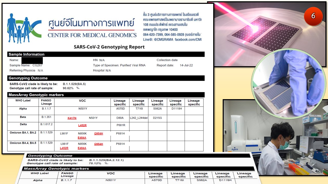 ทางศูนย์จีโนมทางการแพทย์ รพ. รามาธิบดีได้พัฒนาการตรวจวินิจฉัยโควิด-19 ทั้งจีโนมหรือชิ้นส่วนของจีโนมในร่างกายผู้ป่วยลองโควิดอย่างรวดเร็วภายใน 24-48 ชั่วโมงด้วยเทคโนโลยี long-read whole genome sequencing (nonopore platform) (ภาพ5) และ mass array genotyping (ภาพ6) เป็นที่เรียบร้อย