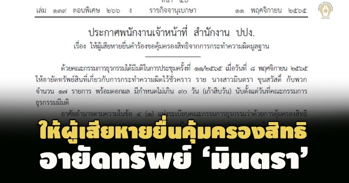 แพร่ประกาศ ปปง. ให้ผู้เสียหายยื่นคำร้องขอคุ้มครองสิทธิจากการกระทำความผิดมูลฐาน หลังสั่งอายัดทรัพย์ 17 รายการ ‘แนน-มินตรา ขุนสวัสดิ์’ พบ เป็น กก.ผู้ถือหุ้นใหญ่ บ.โชคดีลอตเตอรี่ออนไลน์ ตกเป็นข่าวคดีหวยทิพย์