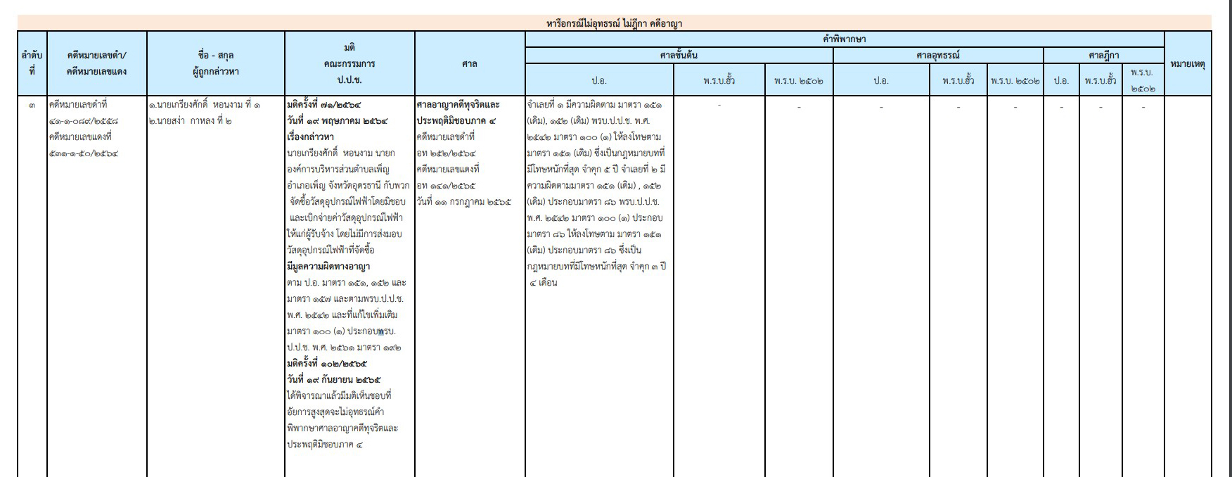 ป.ป.ช.เผยแพร่ความคืบหน้าคดีกล่าวหา 'เกรียงศักดิ์ หอนงาม' อดีตนายก อบต.เพ็ญ อุดรธานี จัดซื้อวัสดุอุปกรณ์ไฟฟ้าโดยมิชอบ ล่าสุด ศาลอาญาคดีทุจริตประพฤติมิชอบภาค 4 พิพากษาลงโทษจำคุก 5 ปี พวก 1 ราย โดนโทษด้วย 3 ปี 4 เดือน