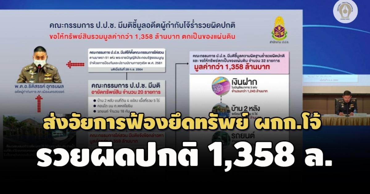 ป.ป.ช.แถลงชี้มูล ผกก.โจ้ร่ำรวยผิดปกติ ส่งสำนวนอัยการขอยึดทรัพย์ 1,358 ล้าน หลังชี้แจงที่มาไม่ได้ พบเงินฝาก 3 บัญชี 1,243 ล้าน เช่าซื้อรถอีกเพียบรวม 15 คัน-เล็งสอบปมสินบนรางวัลนำจับรถหรูต่อ