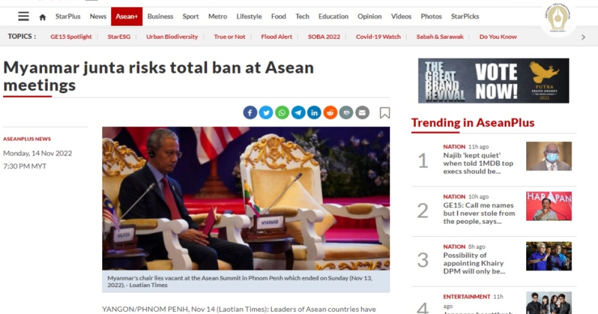 เรียบเรียงจาก:https://www.thestar.com.my/aseanplus/aseanplus-news/2022/11/14/myanmar-junta-risks-total-ban-at-asean-meetings,https://www.nst.com.my/news/nation/2022/11/850667/malaysia-does-not-support-elections-myanmar-promised-junta-next-year-–